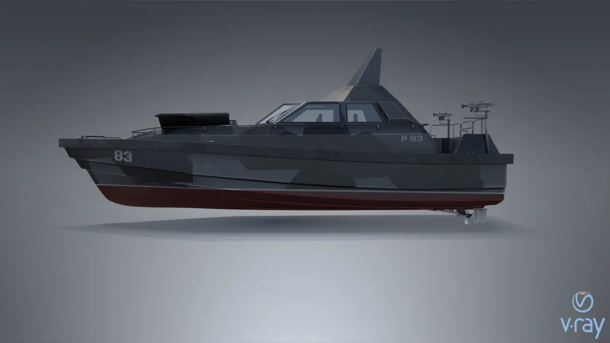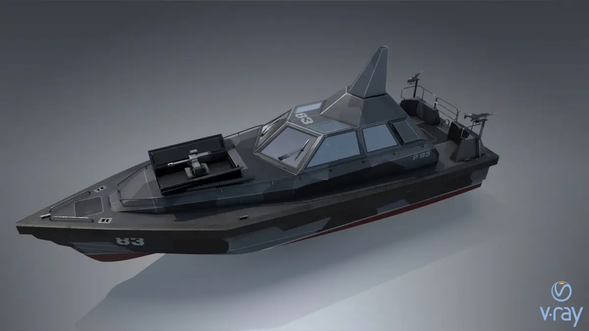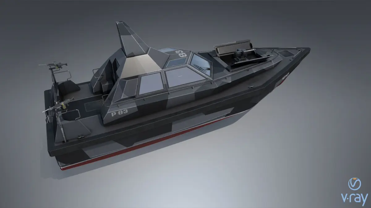 High quality 3D model of stealth patrol boat interceptor Barracuda The model was originally modeled in hard surface technic in 3ds Max, textured with Substance Painter and rendered with V-Ray and Marmoset.