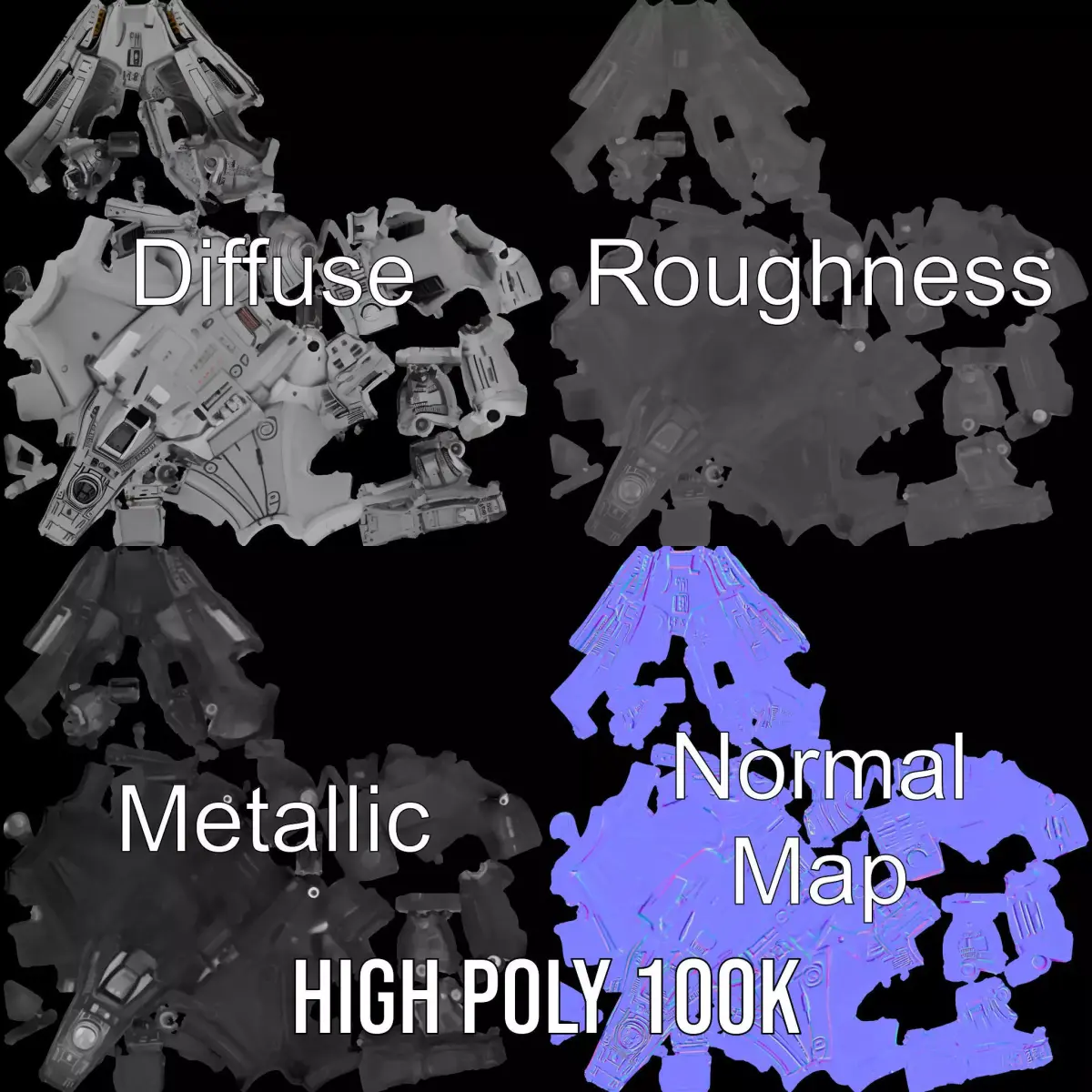 The Stealth Starship model pack offers a sleek and futuristic design suitable for sci-fi projects. Each model has 3 levels of detail: low-poly (1000 triangles for mobile), middle-poly (10,000 triangles for environment), and high-poly (100,000 triangles), which allows for the use of this model in production rendering (such as 3ds Max, Maya, Cinema4D, Blender, Vray/Corona/Cycles, and all others), game engines (Unity and Unreal compatible), and interactive presentations, providing a choice of detail based on the LOD System principle. This model is perfect for creating immersive space battles, futuristic scenes, or adding a touch of high-tech elegance to game environments. The model's textures are PBR, Diffuse, Normal Map, and reflection/roughness/metallic, which are suitable for any modern rendering engine. All models are accurately unwrapped and have no overlapping UV. All textures are 4096*4096 in size. If you like this model, please leave a like and comment!