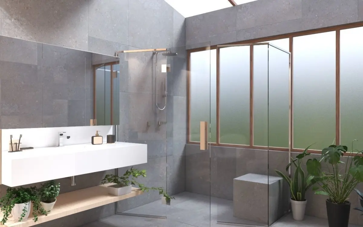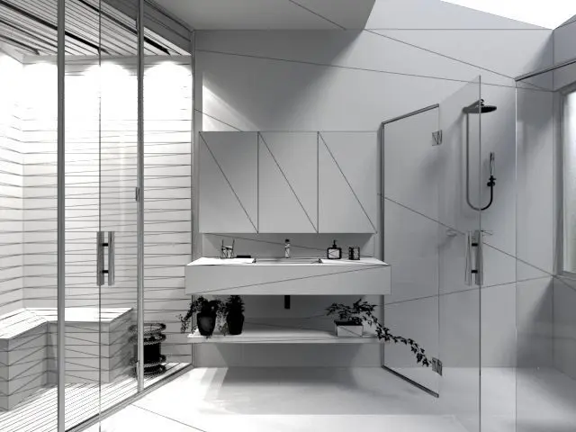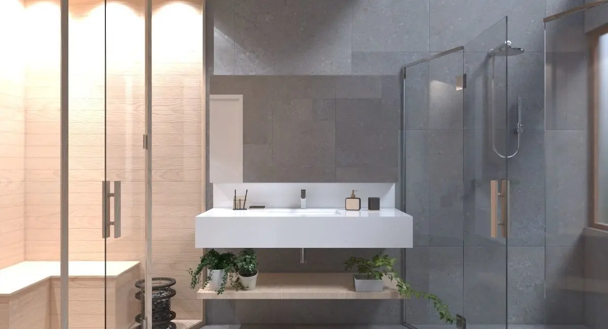 bathroom with dry sauna area and bath area with shower, toilet and bidet, plant and armchairs