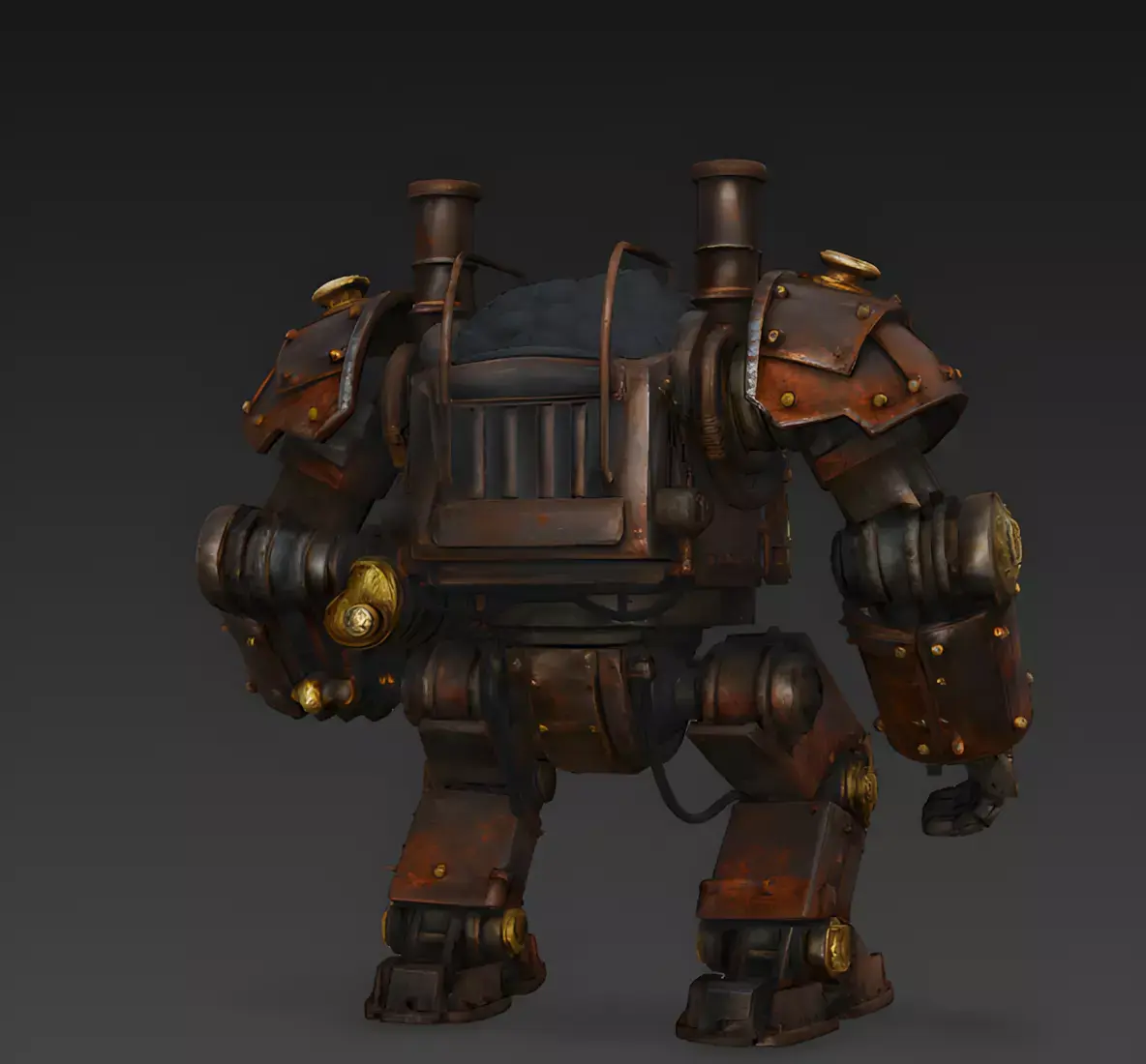 Articulated Iron PlatingThe mech is encased in thick, riveted iron armor plates. The textures feature heavy rust, oil stains, and heat discoloration, giving the machine a lived-in and battle-hardened look that feels grounded in industrial reality.