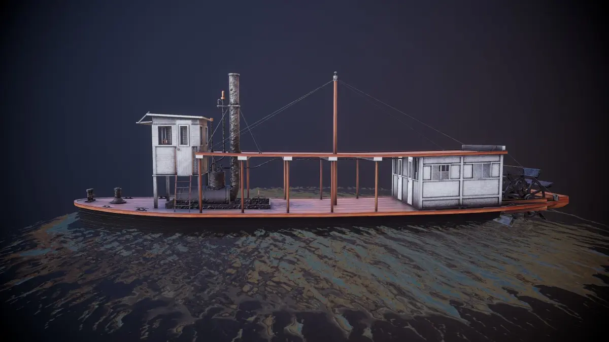A small freight sternwheeler from the 1902 catalog of the Marine Iron Works of Chicago. Model made according to real drawings.Ready to use in game engines (Unity,Unreal,Godot). Ready for use in render scenes.The model has separated doors, steering wheel, steam wheel, steam lever, wheel levers. The steam wheel has a rotation animation. The model can also be used to fill the game scene.Compatible with projects for mobile devices.Two texture sets at 2048 resolution.