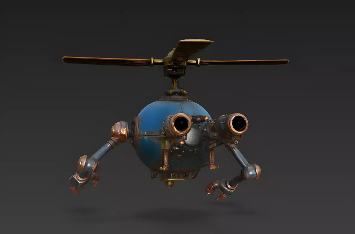 Four-Blade Wooden RotorThe drone is kept airborne by an ornate, four-bladed wooden rotor mounted on a central brass spindle. The blades feature a realistic wood grain texture and a slight motion-blur effect, giving the asset a sense of active flight even in a static pose.