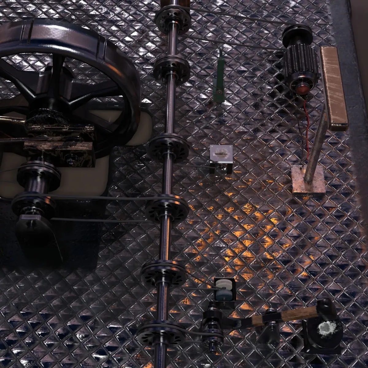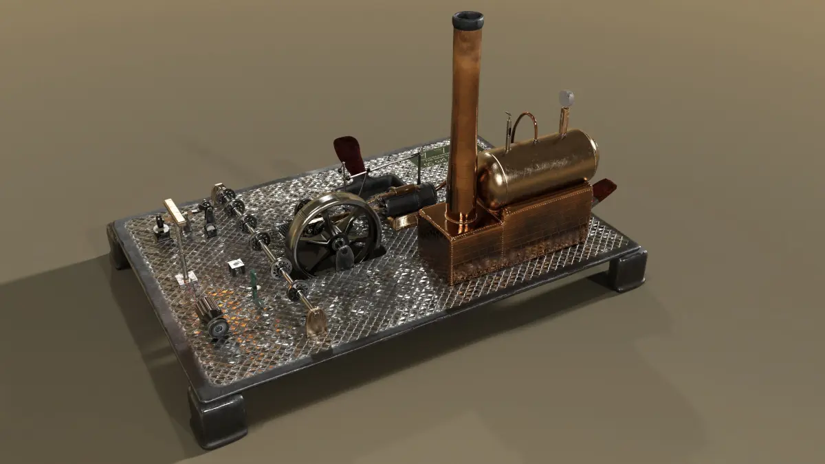 Fully rigged models (Steammachine including oilerlid, oilcan, pressure gauge, funnel for refilling water, lamp with cables, 5 workshop machines and their belts are separate models for free positioning) - except main drive belt and flyweight governor belt (they are fixed parts of steammachine since they are needed anyway).For further information about rigged / animated parts look at pictures please.