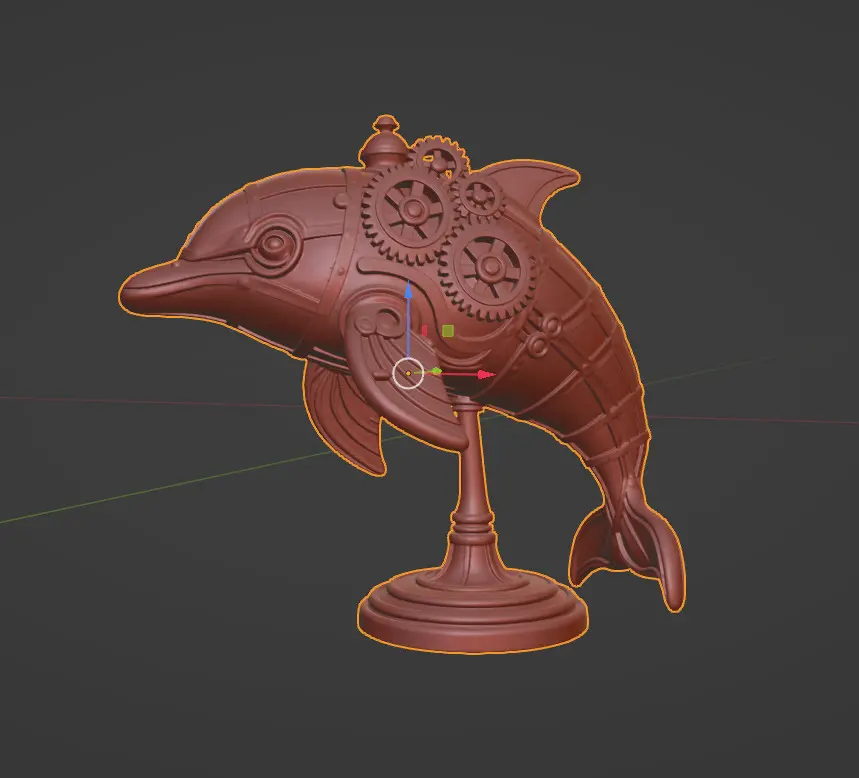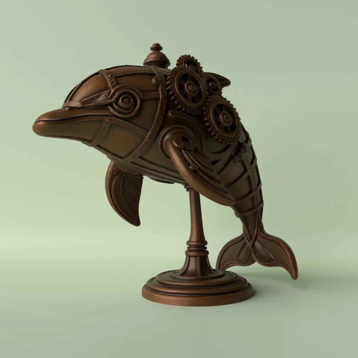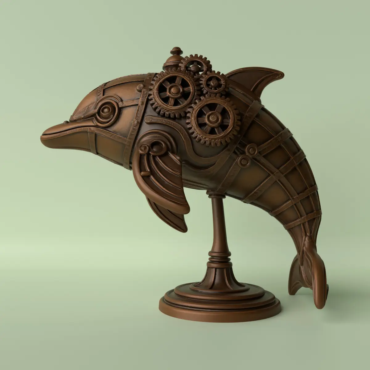A stylized dolphin sculpture in steampunk aesthetic, featuring a body covered in metal plates, articulated joints, gears, and pipes simulating aquatic propulsion. This fusion of nature and machinery creates a unique piece, perfect for fantasy art collections, industrial-style decor, or high-impact 3D printing projects.