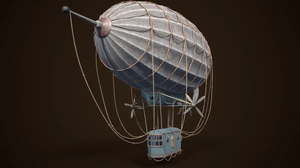 Introducing the Skyward Voyager, a captivating low-poly 3D model of a steampunk airship that seamlessly blends vintage aesthetics with cutting-edge design. The airship features a whimsical fabric tent, billowing in the wind as it gracefully navigates the skies. The gondola, crafted from weathered wood with peeling paint, exudes an authentic steampunk charm, showcasing the wear and tear of countless voyages.
