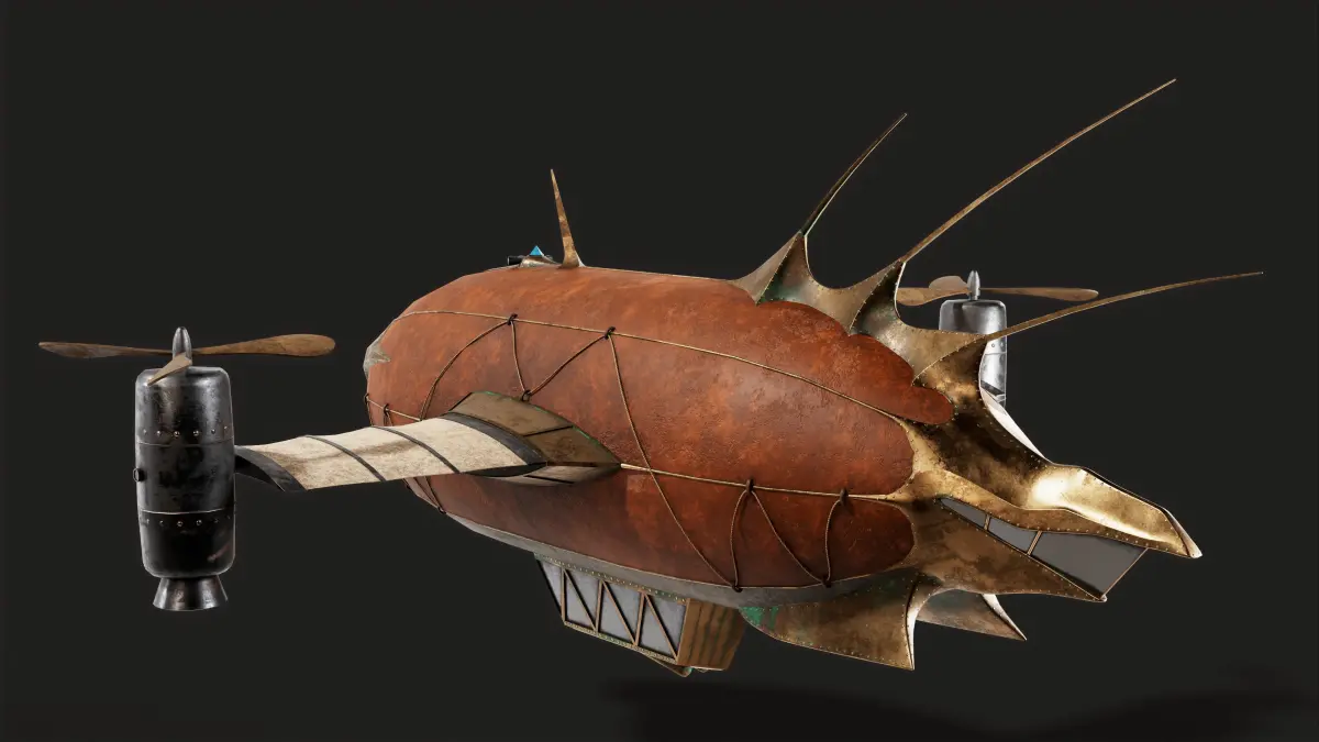 This unique steampunk-style airship features interesting design elements. Its main balloon is textured to resemble leather, with subtle wrinkles and imperfections that give it an organic and worn look. The wings of the craft are a combination of metal and fabric, with metallic frames and taut fabric surfaces. At the tips of the wings, there are large engines with propellers, emphasizing the industrial power of the design.