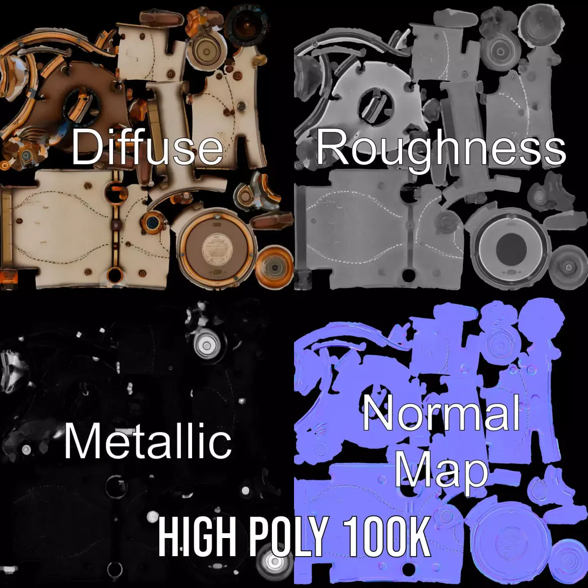 This steampunk boiler model pack combines industrial charm with intricate detailing, ideal for game development or animation in steampunk or industrial settings. Each model has 3 levels of detail: low-poly (1000 triangles for mobile), middle-poly (10,000 triangles for environment), and high-poly (100,000 triangles), which allows for use in production rendering (such as 3ds Max, Maya, Cinema 4D, Blender, Vray/Corona/Cycles), game engines (Unity and Unreal compatible), and interactive presentations, providing a choice of detail based on the LOD system principle. The textures include PBR, Diffuse, NormalMap, and reflection/roughness/metallic, suitable for any modern rendering engine. All models are accurately unwrapped with no overlapping UVs. The first image is the reference used for creating the 3D model. It is important to carefully evaluate the quality of the model by examining the preview images that display the topology and polygonal mesh. These previews (WIRE and WEB 3D Preview) clearly demonstrate how accurately the model matches the original reference and how well the geometry has been executed. All textures are 4096*4096 in size. Perfect for use in virtual reality experiences, film scenes, or as a unique decor element in architectural visualizations. Please like and leave a comment for the model if you liked it.