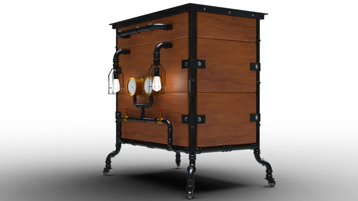 3D model of a stempunk cabinet.Materials are partly textured and partly procedural. Image textures are provided and UV mapped for pipes and wood. They can easily be removed or replaced.Carefully shaped with accurate proportions. Clean and optimised topology is used for maximum polygon efficiency. File version with unapplied modifiers is also included: subdivision surface level can be applied for specific detail required. All objects are properly named and presented as separate parts.Several exchange formats including .blend, .OBJ, .fbx, .DAE, .stlPlease notice that model does not include any backgrounds or scenes used in preview images.Poly count: