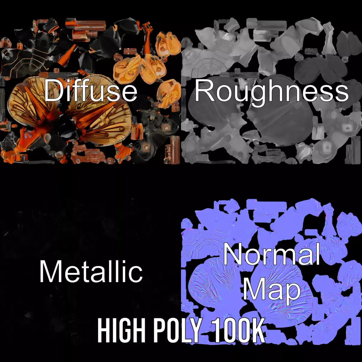This Steampunk Cicada model pack features an intricately designed insect with a futuristic twist, combining metallic elements and organic forms. Each model features three levels of detail: low-poly (1000 triangles for mobile), middle-poly (10,000 triangles for environment), and high-poly (100,000 triangles), allowing for use in production rendering, game engines, and interactive presentations. Perfect for steampunk-themed games, animations, or educational presentations. The PBR textures include Diffuse, NormalMap, and reflection/roughness/metallic maps, sized at 4096x4096, and are suitable for any modern rendering engine. All models are accurately unwrapped with no overlapping UVs. If you like the model, please leave a like and comment!