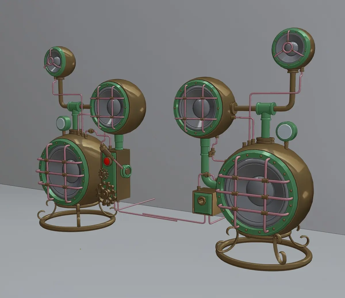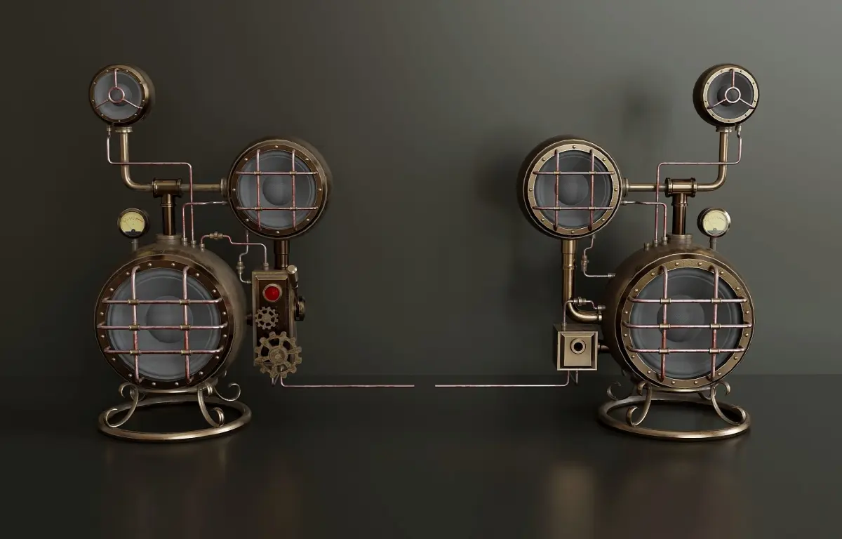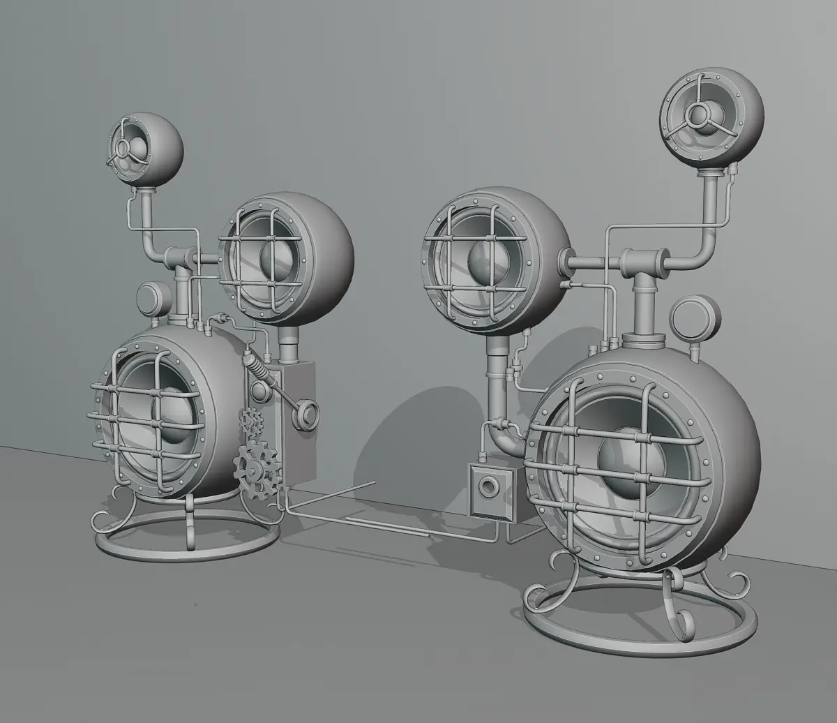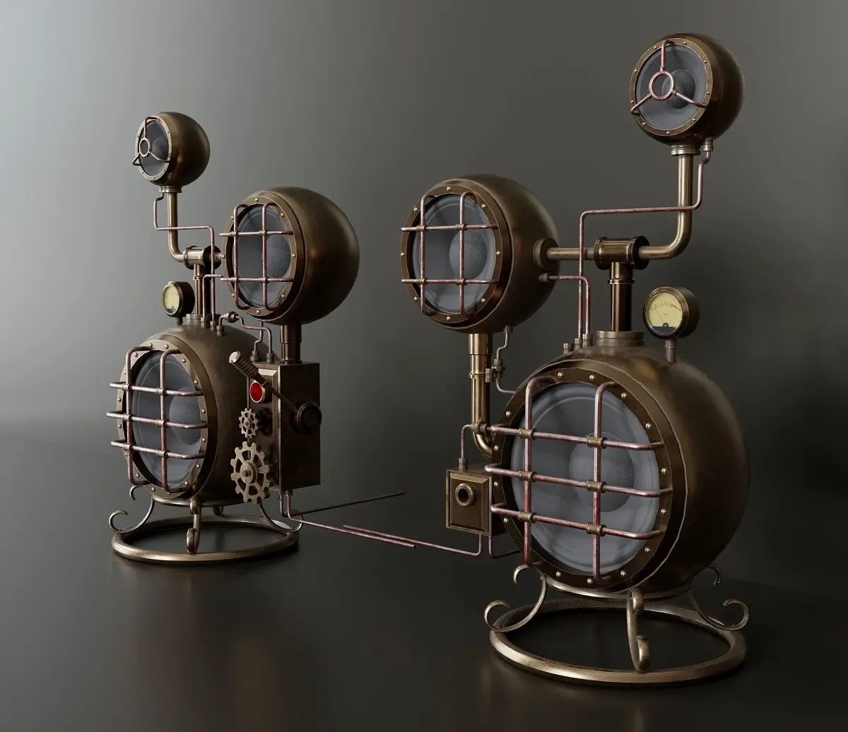 Steampunk computer speakers. The model consists of two objects - left and right speaker. Textures (resolution 4096x4096) were created in the substance painter program and packed into a zip archive. The material of the glass parts is native blender. The VU meter texture is also in the zip archive.