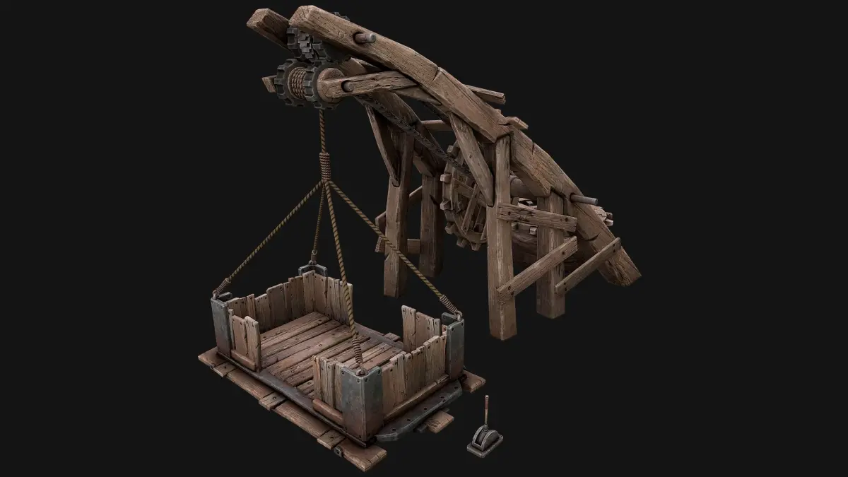 Game ready model .Stylized and detailed Medieval Lift/Crane fully textured, sculpted and rendered with Physical based rendering (PBR) - Shown images have been rendered in Marmoset Toolbag .The model has no rig and Animations.