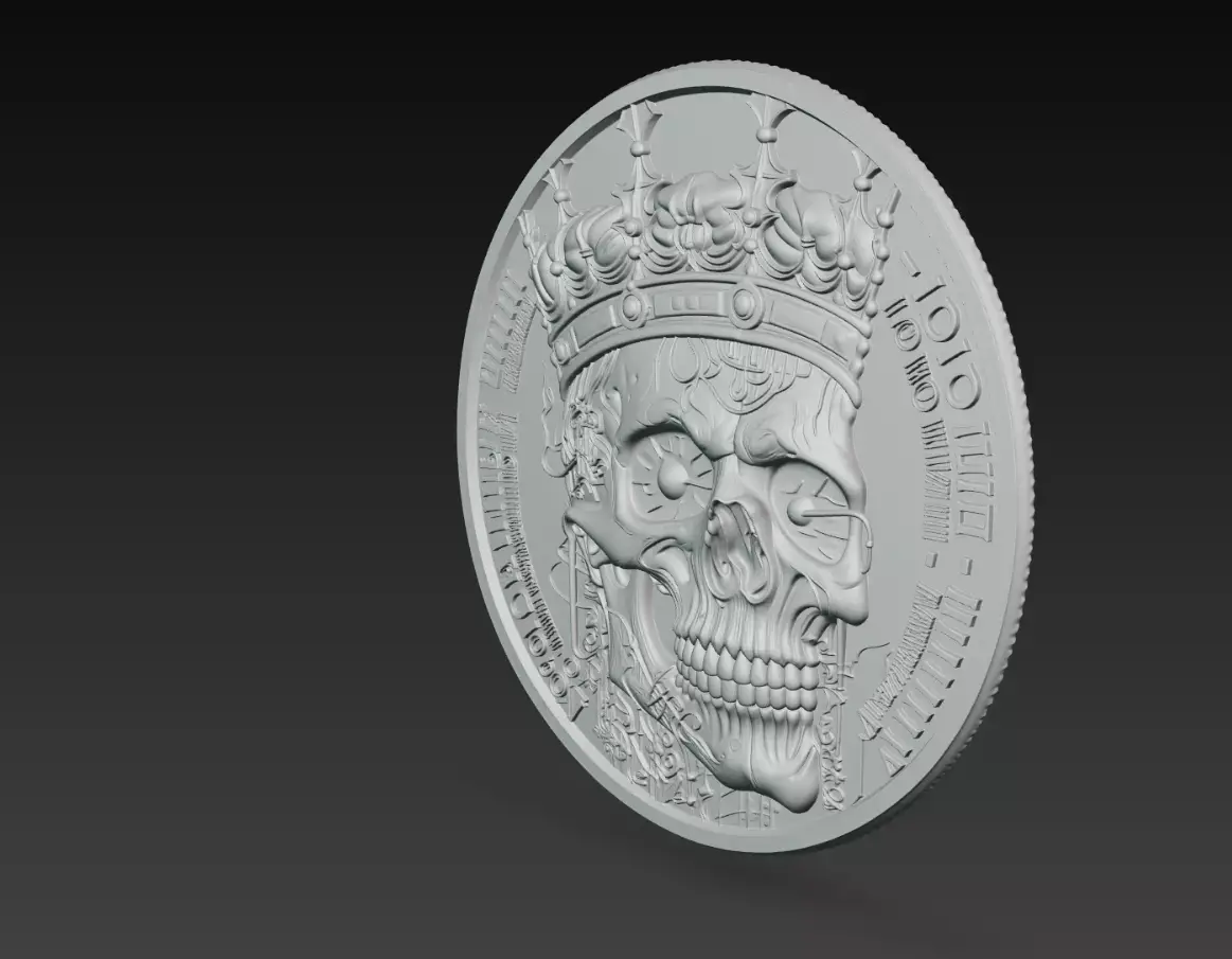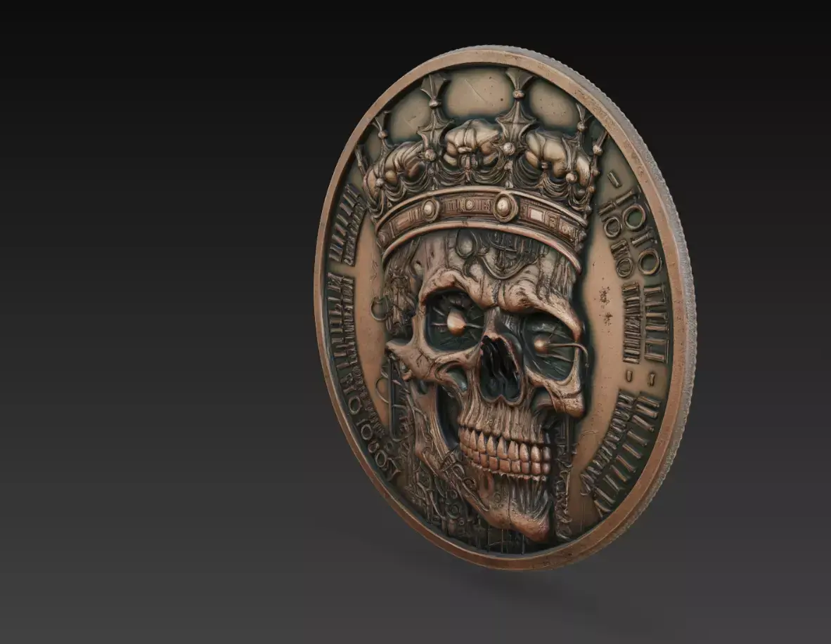 The crown enhances the regal identity of the skull, while the surrounding engraved details and circular medallion frame give the model a vintage coin-like appearance. Fine textures across the skull, metallic elements, and ornamental structures create depth and realism.