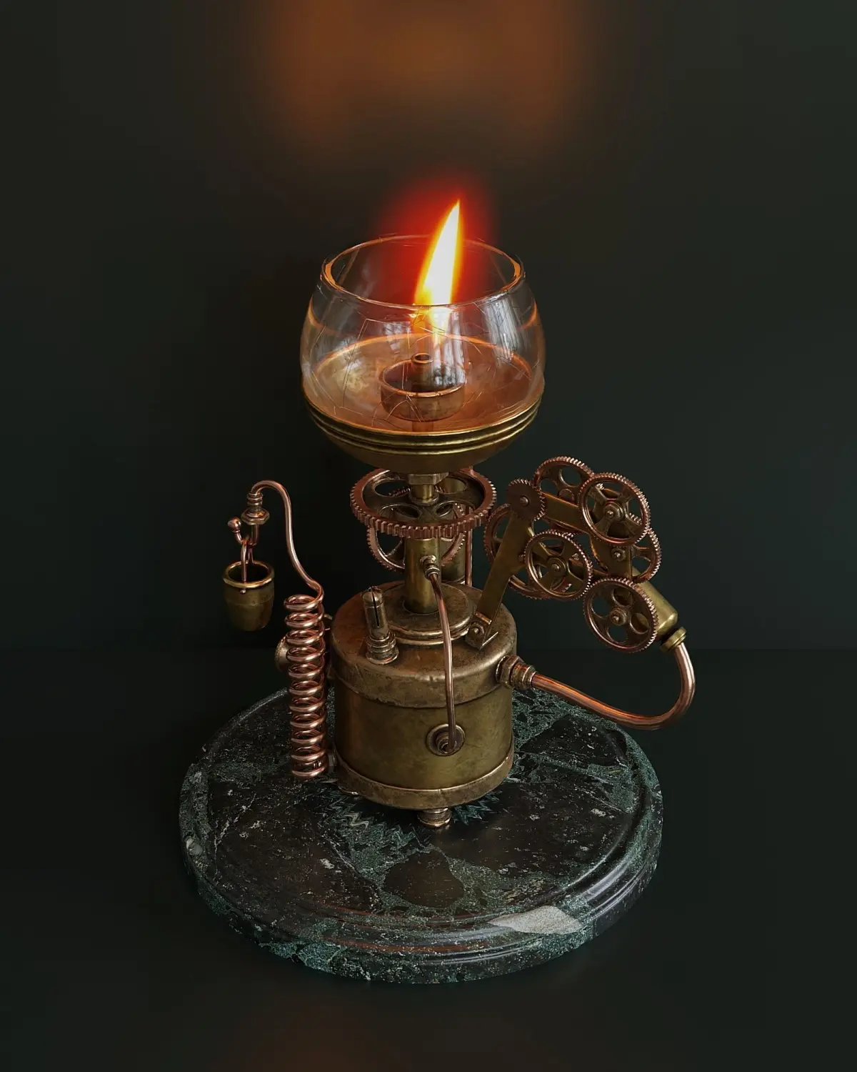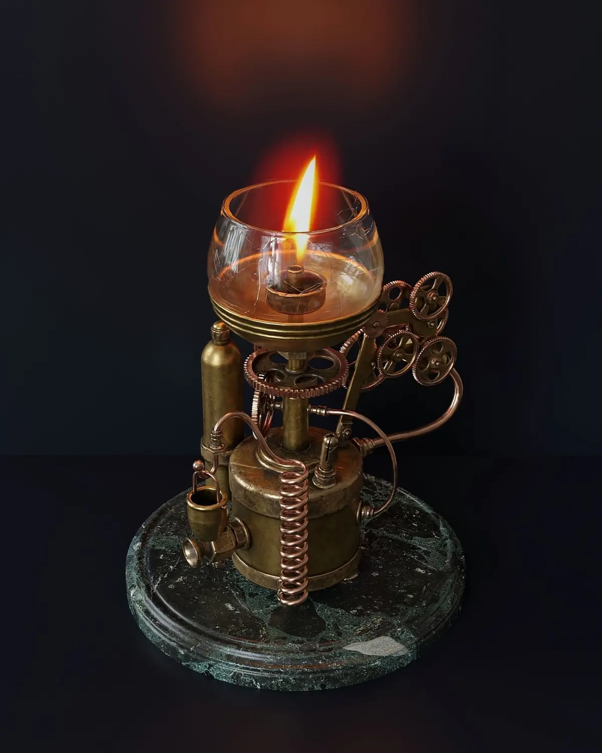 Steampunk decorative table lamp. The model consists of two objects: a lamp and a marble stand ( + a polygon (png image with a flame) and an attached flame illumination lamp (point )) (All bindings are only in the blend format file; in other formats, objects have no binding to each other) Materials (resolution 2048x2048) are made in the substance painter program. All textures are packed in a zip archive. In the second zip archive the textures of marble and flame.