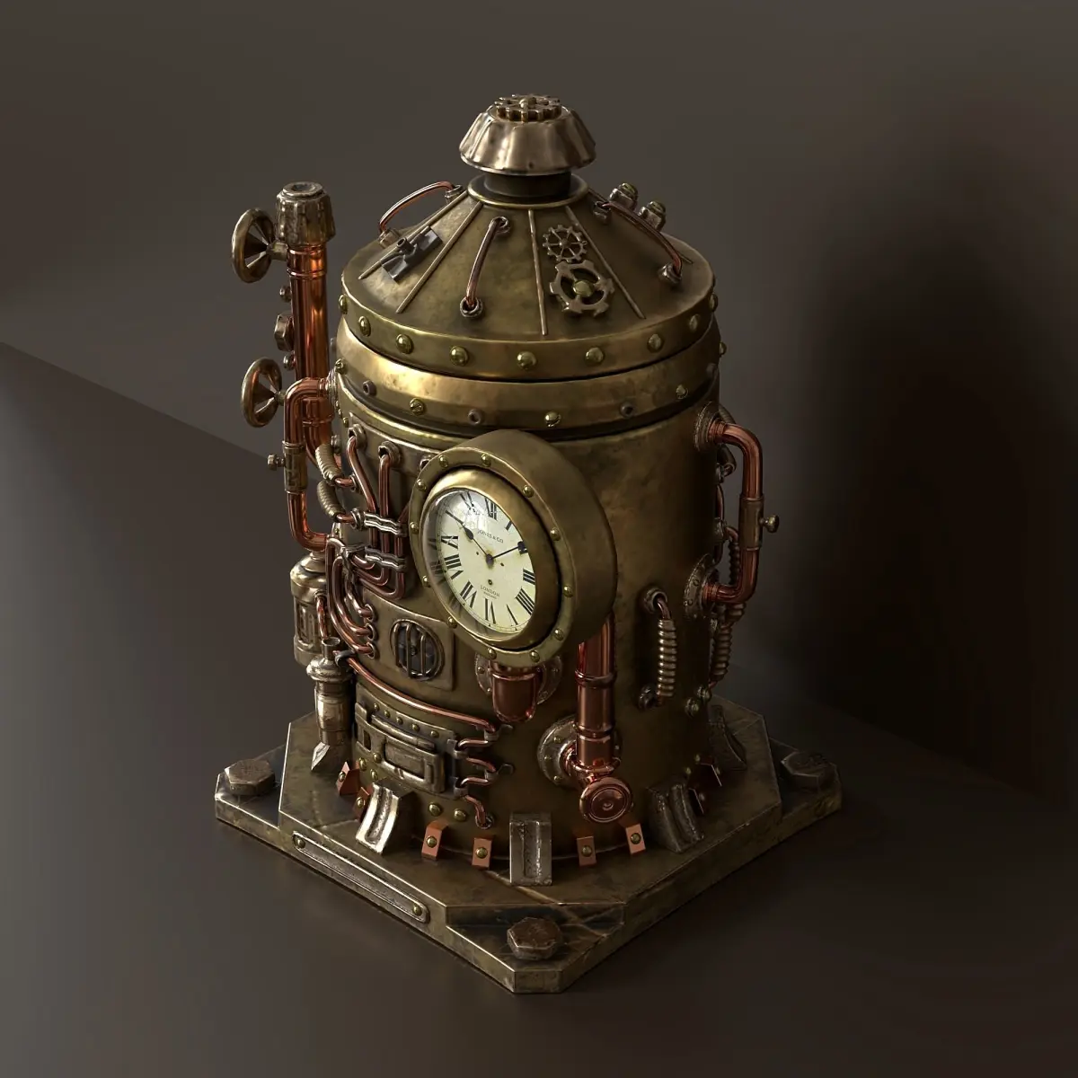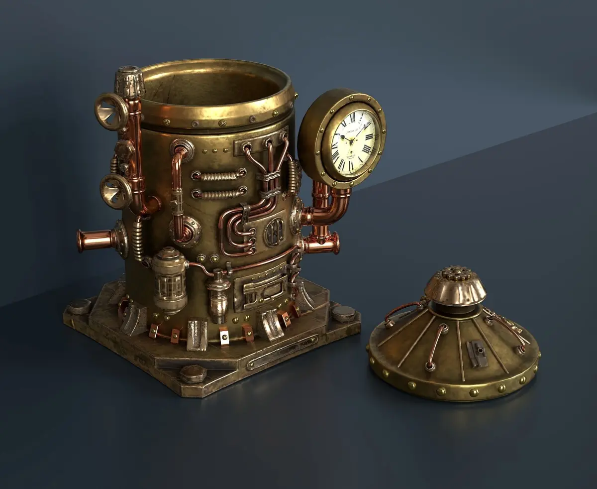Table box with a steampunk clock. The model consists of two objects: a box and a lid. (objects are not attached to each other) The materials were created in the substance painter program. All textures (2048x2048) are packed in a zip archive. The clock texture is packed into the second archive.