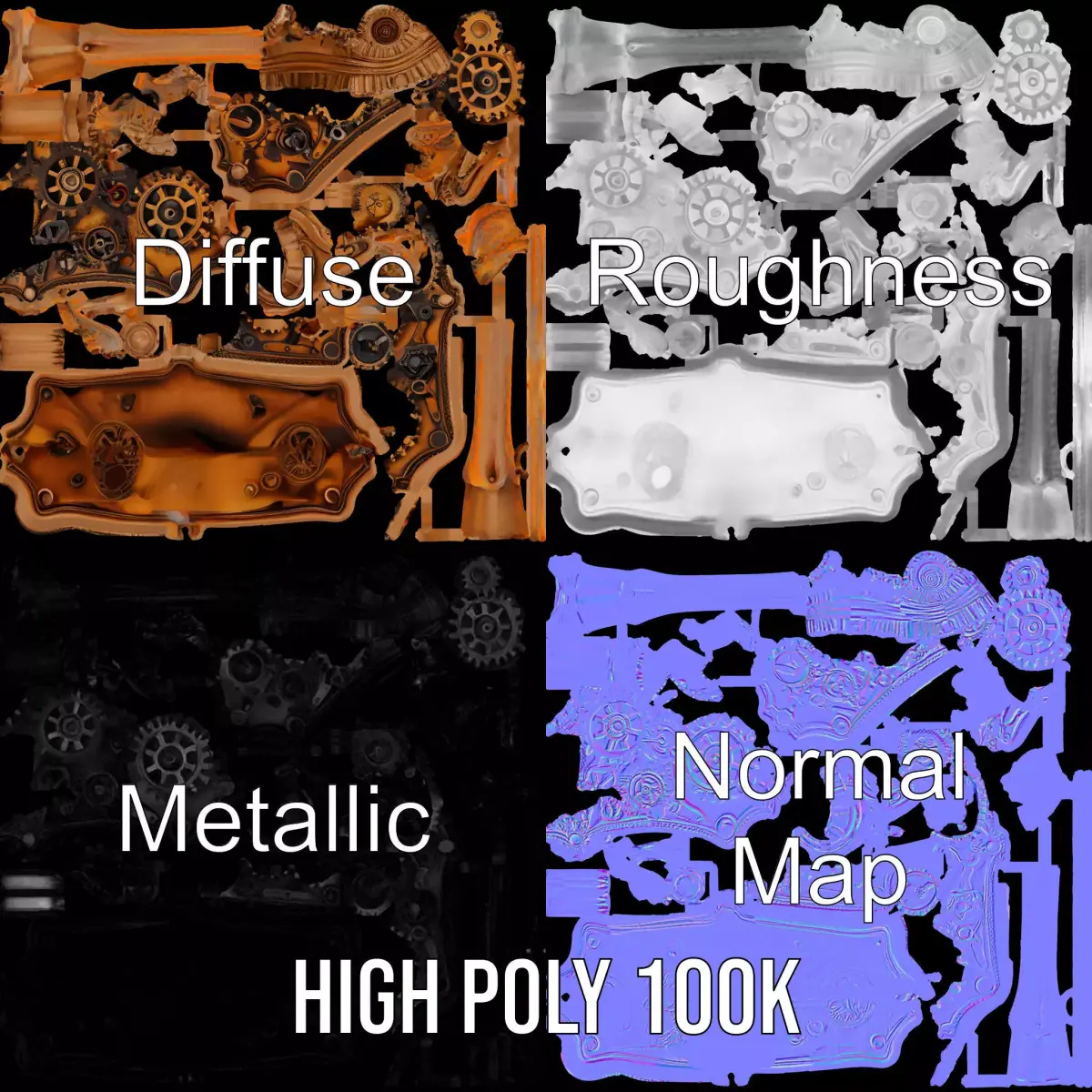 The Steampunk Gear Mechanism model pack features an intricate arrangement of vintage gears and cogs in a steampunk aesthetic, perfect for interior design, game environments, or as a decorative element in animations. Each model has 3 levels of detail: low-poly (1000 triangles for mobile), middle-poly (10,000 triangles for environment), and high-poly (100,000 triangles), ideal for production rendering in software like 3ds Max, Maya, Cinema 4D, Blender, Vray/Corona/Cycles, game engines (Unity and Unreal compatible), and interactive presentations, providing a choice of detail based on the LOD System principle. This model is great for creating atmospheric steampunk settings or adding complexity to designs requiring a vintage mechanical feel. The model's textures are PBR, Diffuse, NormalMap, and reflection/roughness/metallic, suitable for any modern rendering engine. All models accurately unwrapped with no overlapping UV. All textures are 4096*4096 in size. Please like and leave a comment if you enjoy this model!