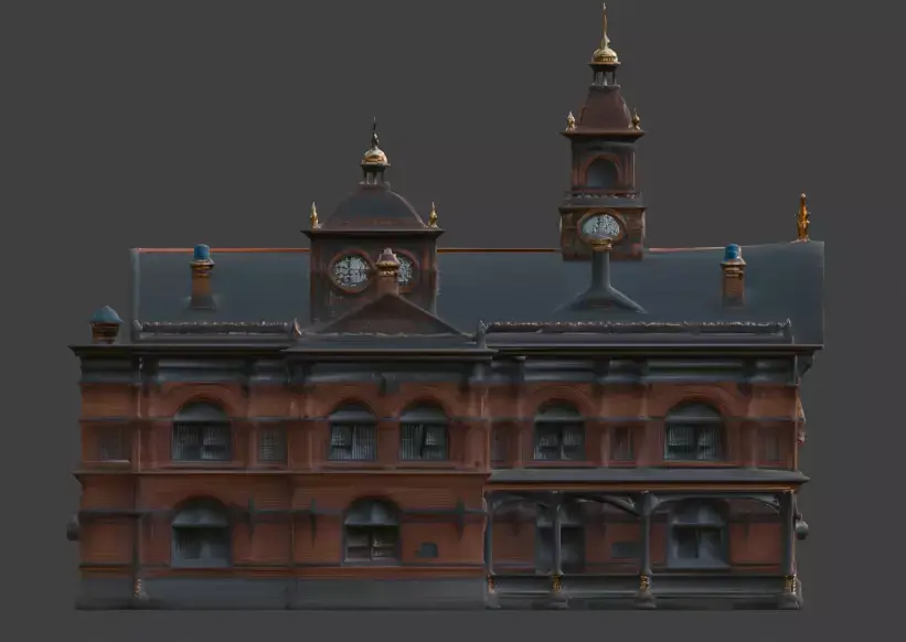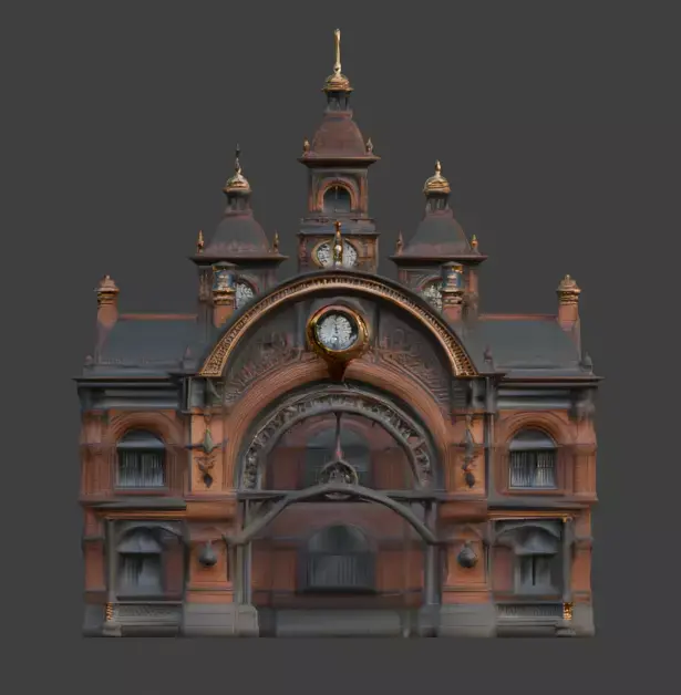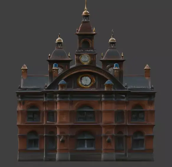 Tagssteampunk, train station, victorian, industrial, architecture, clockwork, gears, steam engine, arches, brass, iron, city landmark, travel hub, 3d model