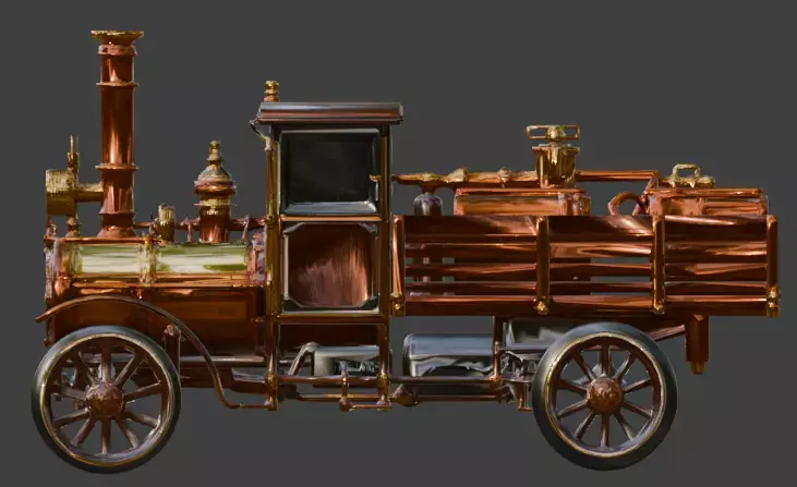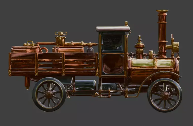 Tagssteampunk, cargo truck, heavy vehicle, industrial, victorian, steam engine, brass, copper, gears, pistons, transport, 3d model, game asset, prop, retro futuristic