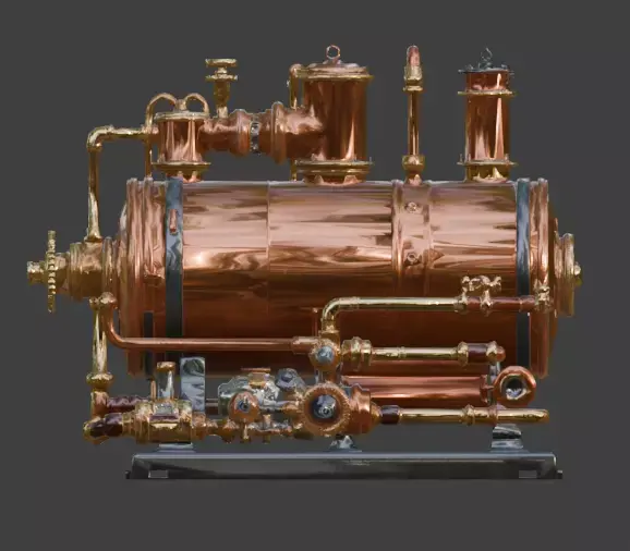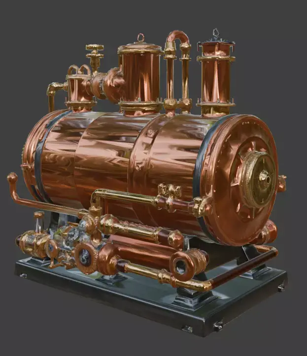 Key FeaturesDetailed Copper Boiler Core: Features a high-resolution cylindrical boiler with realistic metallic oxidation, scratches, and industrial riveted plating.