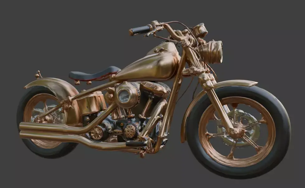 Steampunk High-Performance Motorcycle 3D ModelDescriptionA premium, high-quality 3D model of a heavy-duty motorcycle designed with a sophisticated Victorian retro-futuristic aesthetic. The vehicle features a polished brass chassis with copper accents and a powerful steam-driven engine at its core.