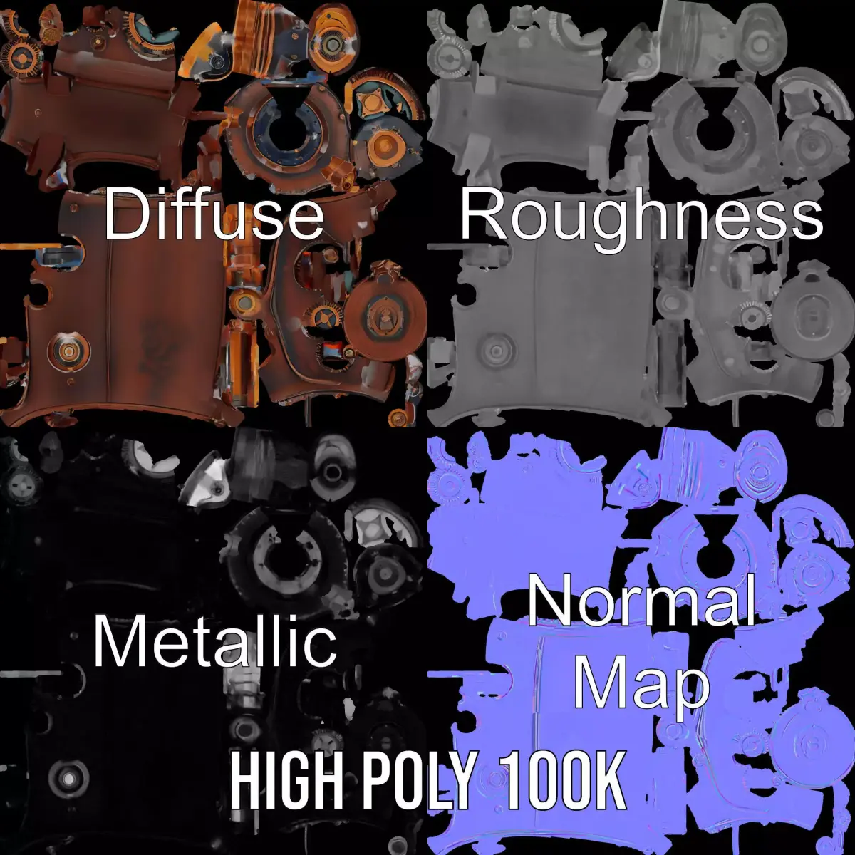 This steampunk industrial boiler model pack features intricate machinery and vintage design elements suitable for fantasy and sci-fi environments. Each model has 3 levels of detail: low-poly(1000 triangles for mobile), middle-poly(10,000 triangles for environment), and high-poly(100,000 triangles), which allows for the use of this model in production rendering(such as 3ds Max, Maya, Cinema4D, Blender, Vray/Corona/Cycles and all others), game engines(Unity and Unreal compatible), and interactive presentations, providing a choice of detail based on the LOD System principle. Ideal for steampunk-themed games, futuristic simulations, and stylized animations. The model's textures are PBR, Diffuse, NormalMap, and reflection/roughness/metallic, which are suitable for any modern rendering engine. All models accurately unwrapped and have no overlapping UV. All textures are 4096*4096 in size. The first image is the reference used for creating the 3D model. It is important to carefully evaluate the quality of the model by examining the preview images that display the topology and polygonal mesh. These previews (WIRE and WEB 3D Preview) clearly demonstrate how accurately the model matches the original reference and how well the geometry has been executed. Please like and leave a comment for the model if you enjoyed it.