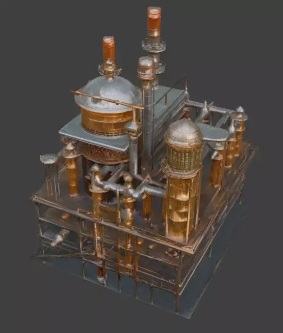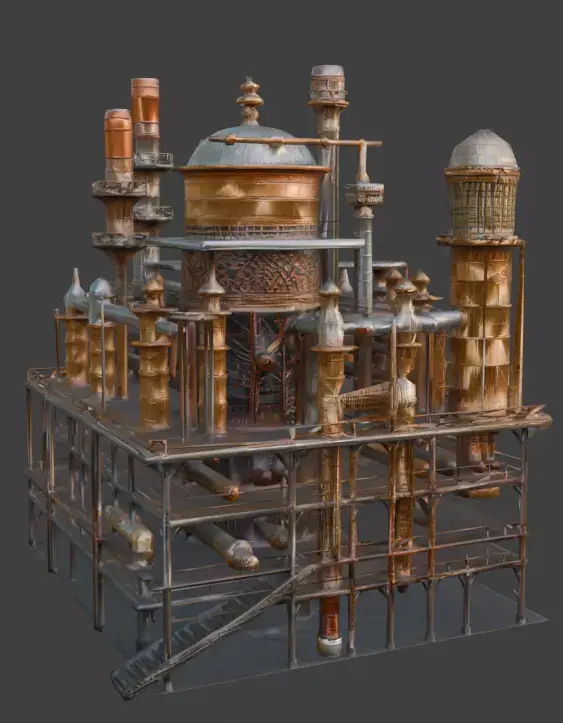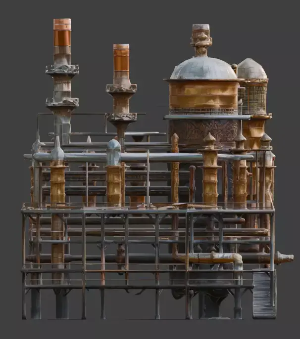 Tagssteampunk, factory, industrial, building, structure, victorian, brass, iron, steam engine, boiler, pipes, gears, machinery, architecture, 3d model, game asset
