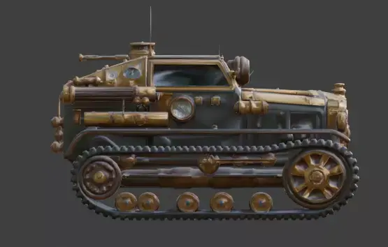 Tactical Details: Includes side-mounted steam pipes, specialized storage canisters, and a small rooftop turret or hatch for combat-ready visualization. Tagssteampunk, armored vehicle, scout car, tank, half-track, victorian, industrial, brass, iron, steam engine, treads, machinery, vehicle, 3d model, game asset