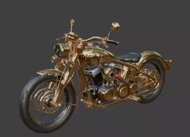 Steampunk Luxury High-Performance Motorcycle 3D ModelDescriptionA premium, high-quality 3D model of a luxury heavy-duty motorcycle featuring a sophisticated Victorian retro-futuristic aesthetic. The vehicle is meticulously crafted with a polished, reflective gold-brass frame and accented with weathered copper engine components. Its design showcases complex mechanical detailing, including exposed cylinder heads, copper heat-exchange pipes, and an intricate belt-drive system. The motorcycle features a large, front-mounted circular headlamp with a specialized dark dial face, dual circular mirrors, and a minimalist black leather solo seat. Presented as a full object isolated on a clean white background, this asset is an ideal choice for high-end hero vehicles in industrial-fantasy games, cinematic animations, or luxury retro-futuristic environments.
