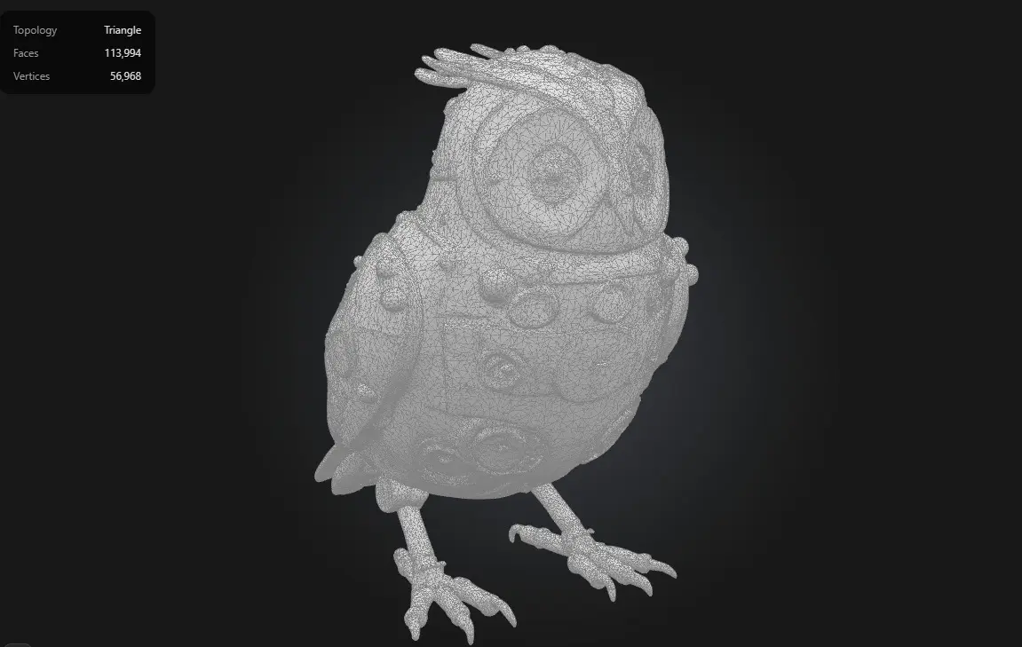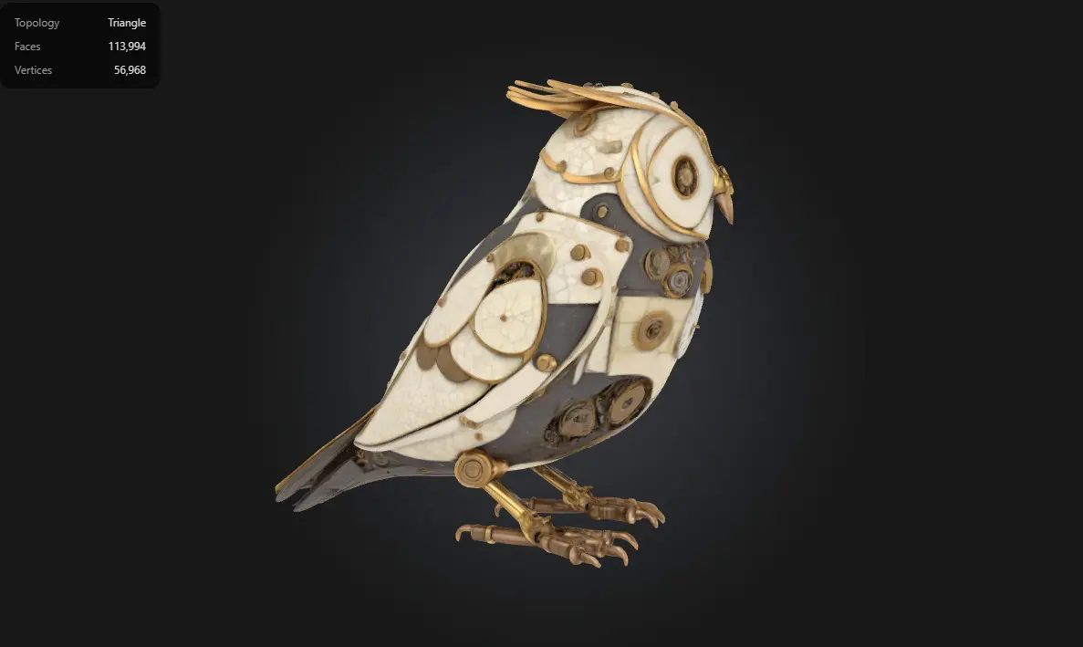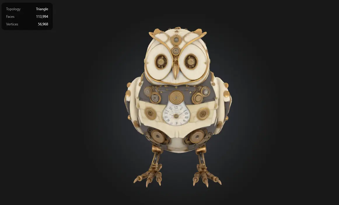 This highly detailed Steampunk Mechanical Owl is crafted from intricate clock gears, brass components, and ivory-like surfaces. Featuring vintage watch faces and layered mechanical detailing, this model is ideal for cinematic projects, collectibles, or premium steampunk environments. With over 110K faces, it’s optimized for high-quality renders and stylized animation—not recommended for low-poly games or VR/AR without LOD adjustments.