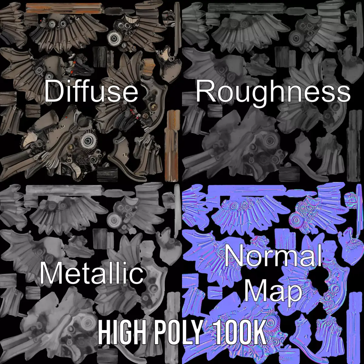 This Steampunk Mechanical Wings model pack showcases intricately designed gears and feathered elements resembling mechanical wings. Each model has 3 levels of detail: low-poly (1000 triangles for mobile), middle-poly (10,000 triangles for environment), and high-poly (100,000 triangles), which allows for use in production rendering (such as 3ds Max, Maya, Cinema 4D, Blender, V-Ray/Corona/Cycles, and others), game engines (Unity and Unreal compatible), and interactive presentations, providing a choice of detail based on the LOD System principle. Ideal for use in fantasy, sci-fi game design, cinematic environments, and artistic visualizations. The model's textures are PBR, Diffuse, NormalMap, and reflection/roughness/metallic, which are suitable for any modern rendering engine. All models are accurately unwrapped with no overlapping UVs. All textures are 4096*4096 in size. If you like it, please give a like and leave a comment for the model.