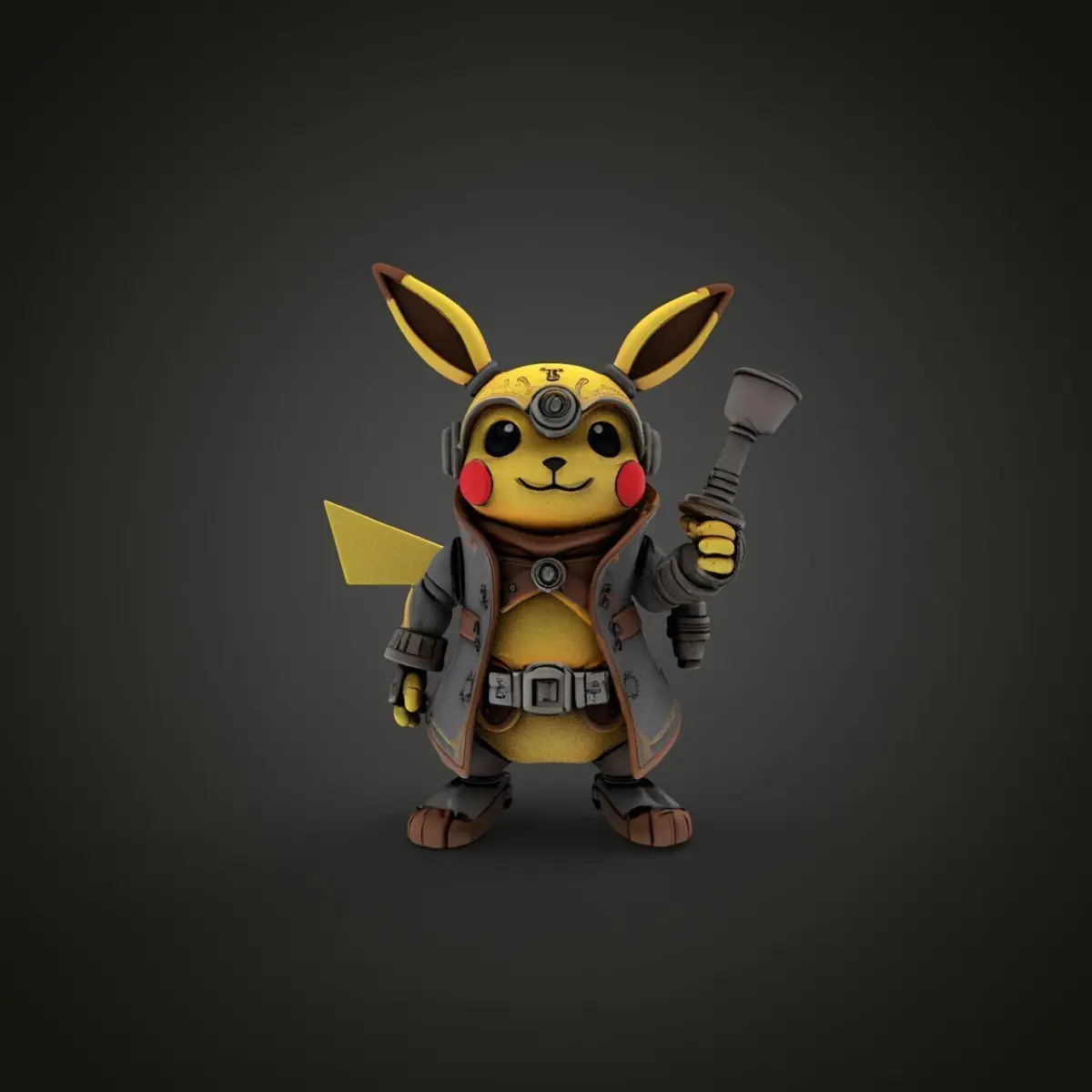 This 3D model printed steampunk Pikachu reimagines the beloved electric Pokémon in a world of brass and steam. Adorned with tiny gears, goggles, and metallic accents, this unique design fuses Pikachu’s playful charm with the intricate craftsmanship of steampunk aesthetics. Perfect for collectors, fans of alternate universe styles, or as a standout display piece, this model offers a whimsical twist on a classic character.