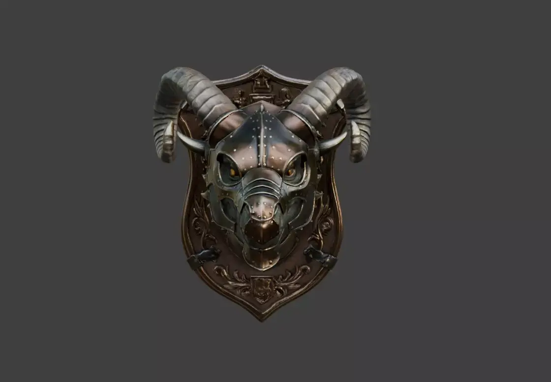 The Steampunk Ram Guardian Wall Trophy is a highly detailed fantasy creature head designed as a mounted decorative wall piece, blending industrial steampunk engineering with mythic beast aesthetics. This 3D model captures the commanding presence of a horned ram encased in reinforced metal armor, mounted on an ornate wooden shield plaque. It is a powerful decorative prop ideal for fantasy taverns, medieval halls, steampunk interiors, RPG environments, and cinematic storytelling scenes.
