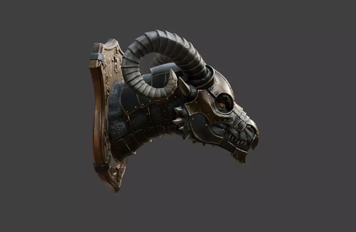 The decorative wall plaque backing the head features carved wooden ornamentation, shield-like contours, and engraved patterns that reinforce its trophy presentation style. The contrast between polished metal armor, textured organic horns, scaled skin, and carved wood creates strong material diversity—ideal for physically based rendering workflows.
