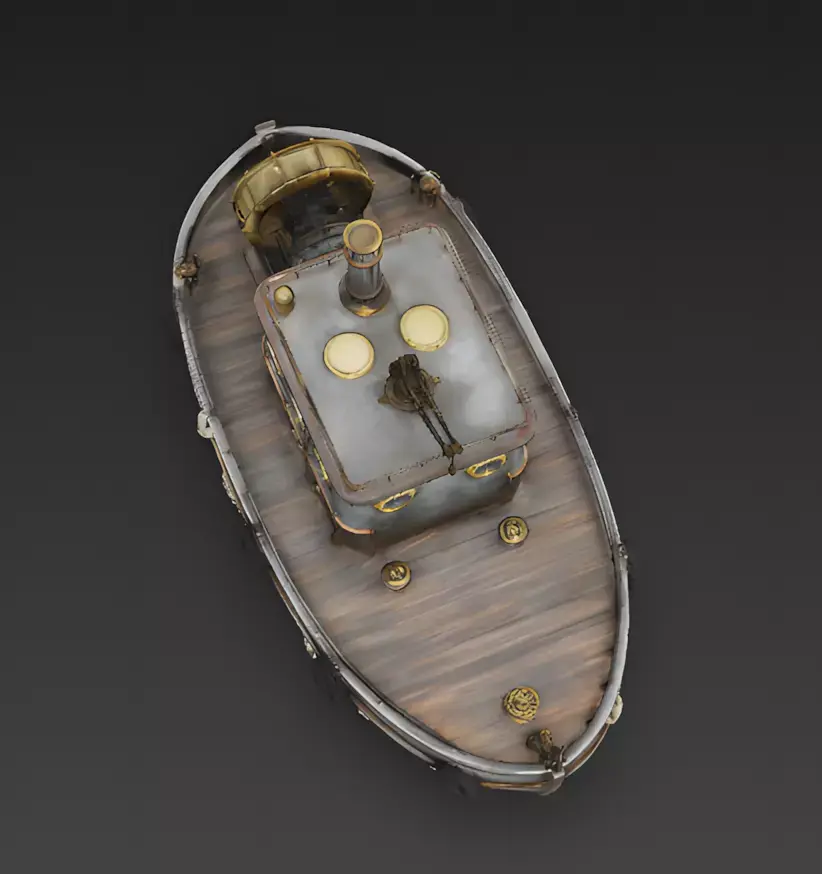 Brass Paddlewheel Instead of a propeller, this boat moves using a large, golden brass wheel on the side. This paddlewheel is a signature feature of steam-powered technology, adding a moving mechanical element to the design.