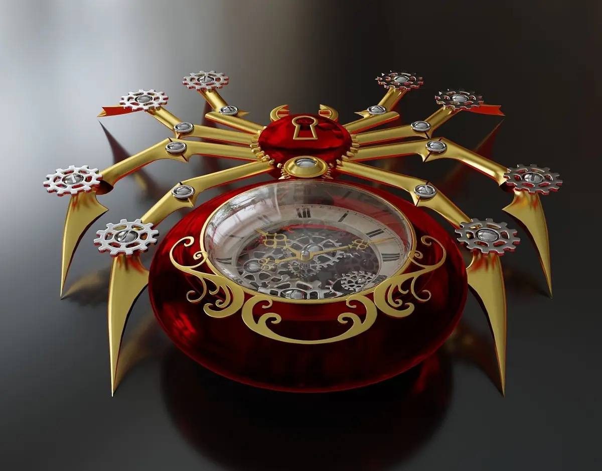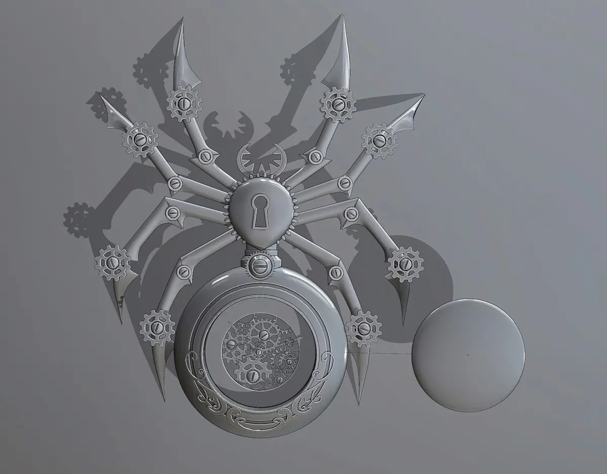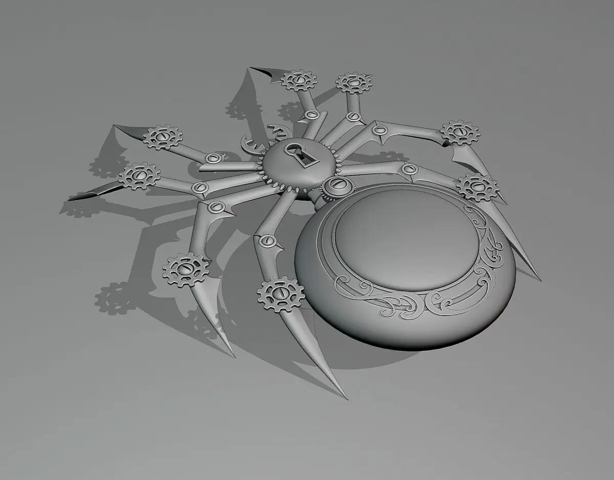 Steampunk spider brooch. Could be a keychain (?) gift item. The model consists of two meshes - spider and glass on the dial.The glass is attached to the main body. The actual dimensions are unknown. You can scale to your liking.