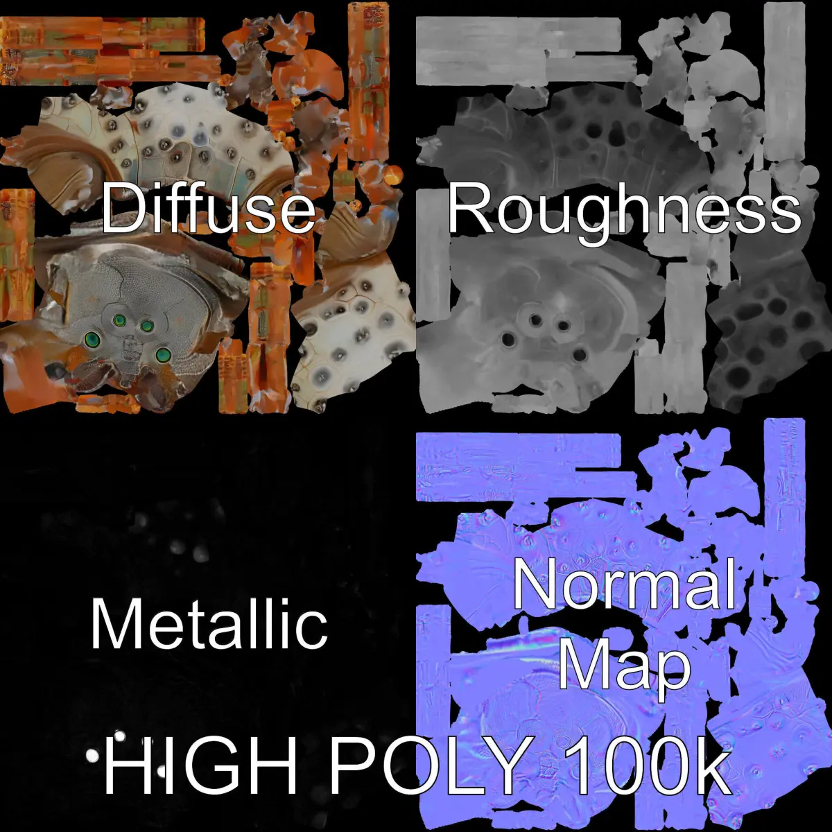 This Steampunk Spider Model Pack offers a versatile and detailed model for use in various applications. With three levels of detail, including low-poly for mobile, middle-poly for environments, and high-poly for production rendering, it's perfect for games, animations, and VR/AR experiences. The model is created with meticulous attention to detail and precision, featuring PBR textures including Diffuse, NormalMap, reflection, roughness, and metallic, all at a high resolution of 4096x4096.