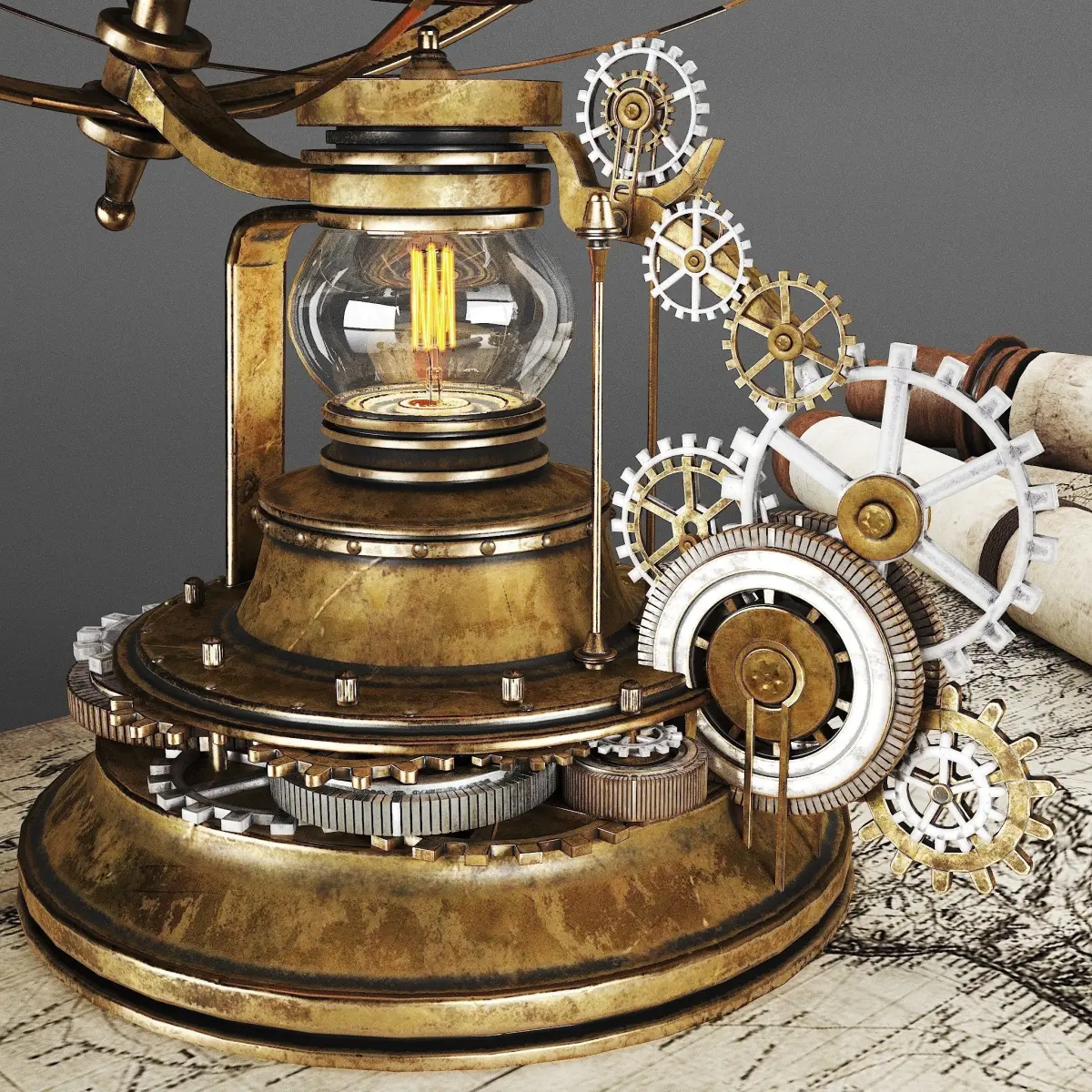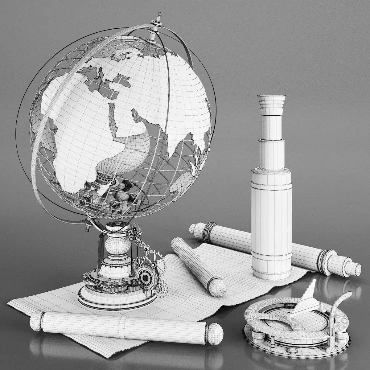 Traveler's set with steampunk style. A globe lamp on a support made of mechanisms, a set of maps, a telescope in a leather winding, a stylized compass with a level and a sundial.