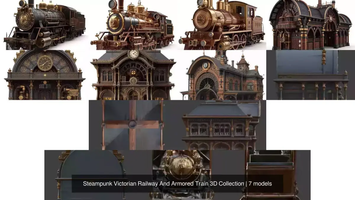 Collection DescriptionA detailed steampunk-themed collection of grand Victorian train stations and heavily armored trains. Perfect for industrial, fantasy, or alternate-history environments, cinematic storytelling, and stylized game assets. Each model includes intricate mechanical details, stylized steampunk aesthetics, and optimized geometry for smooth real-time performance.