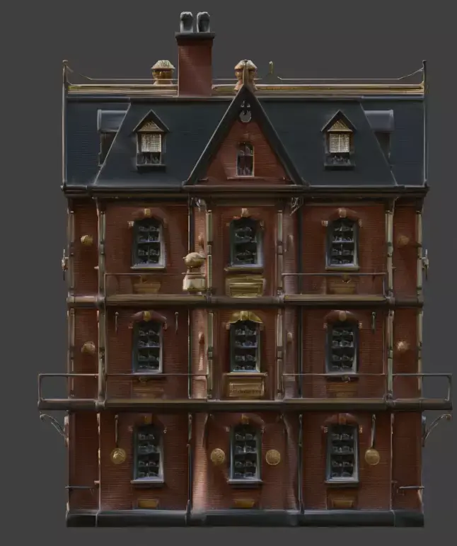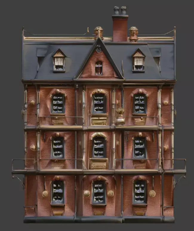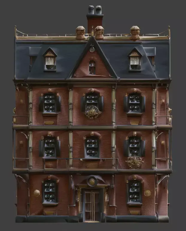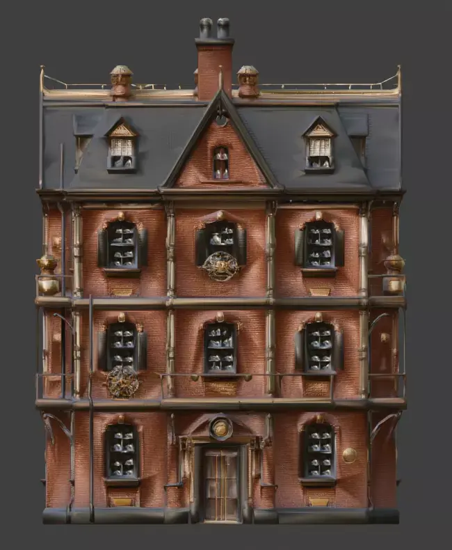 External Steam Infrastructure: Includes vertical copper piping and specialized steam vents to emphasize the building's retro-futuristic utility.Tagssteampunk, building, residential, house, victorian, industrial, architecture, brick, brass, gears, balconies, steam pipes, 3d model, game asset, urban