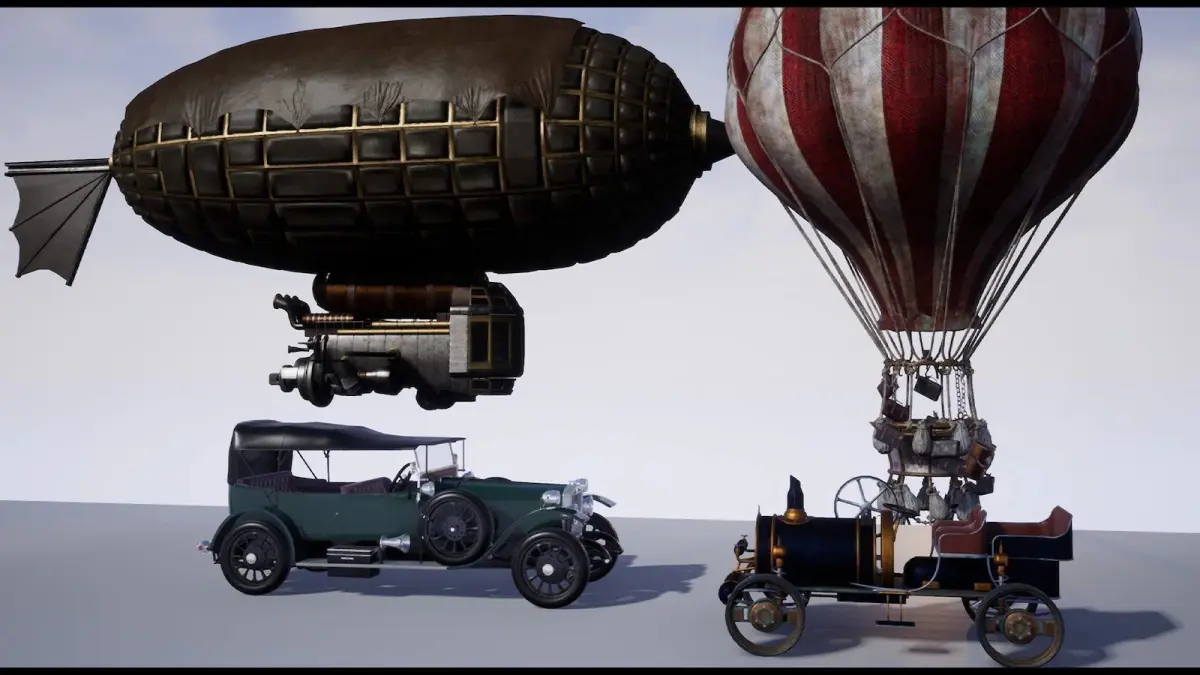 SteamPunk/Victorian Vehicles (Set of 5), AAA Quality, Includes 2 Cars, 1 Zeppelin, 1 Baloon, 1 Bicycle Assets, great attention to details and Cars have Different Materials Options, Great Assets/Vehicles to use in Your Steampunk and/or Victorian Levels.