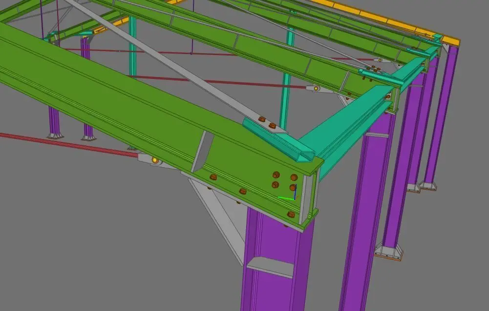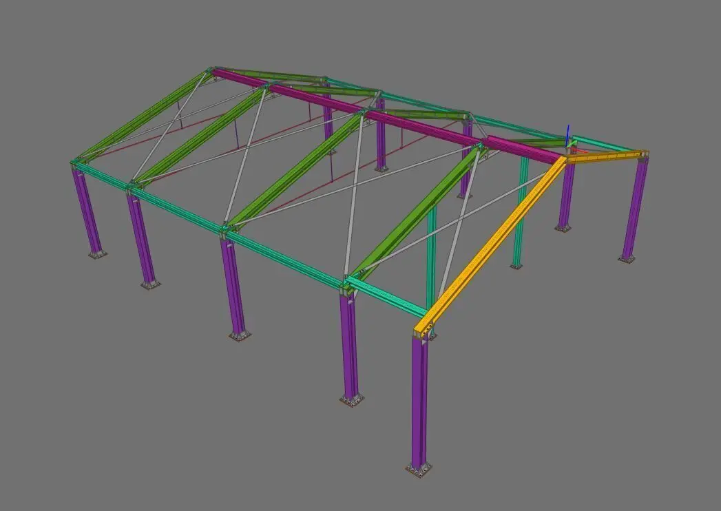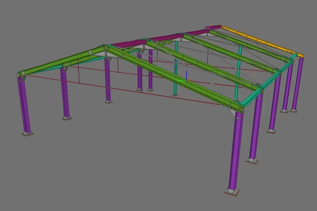 This model represents a detailed steel canopy structure, suitable for architectural and structural engineering use. The model includes beams, columns, bracing, and base plate elements, designed using Tekla Structures, BIM methodology and exported in multiple formats.