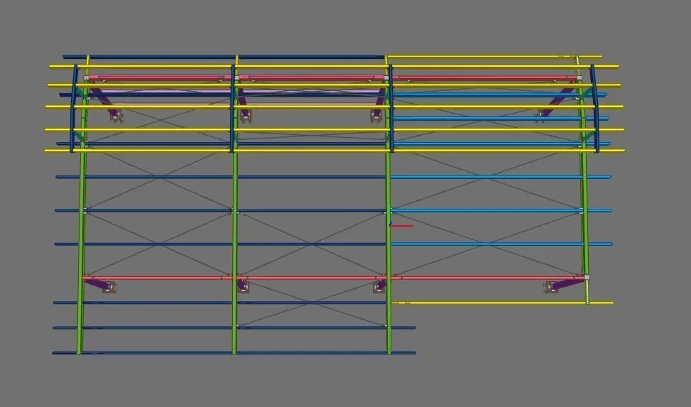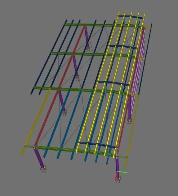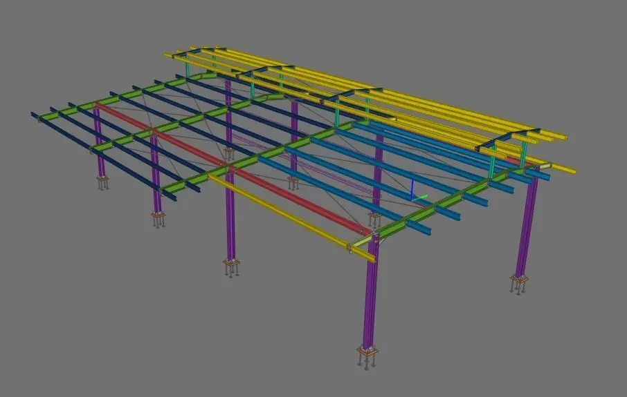 This model represents a detailed steel canopy structure, suitable for architectural and structural engineering use. The model includes beams, columns, bracing, and base plate elements, designed using BIM methodology and exported in multiple formats.
