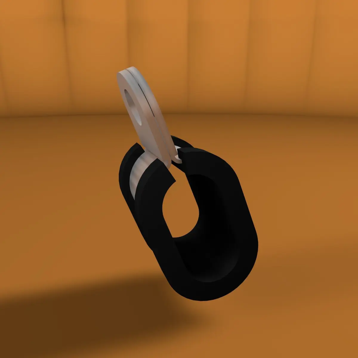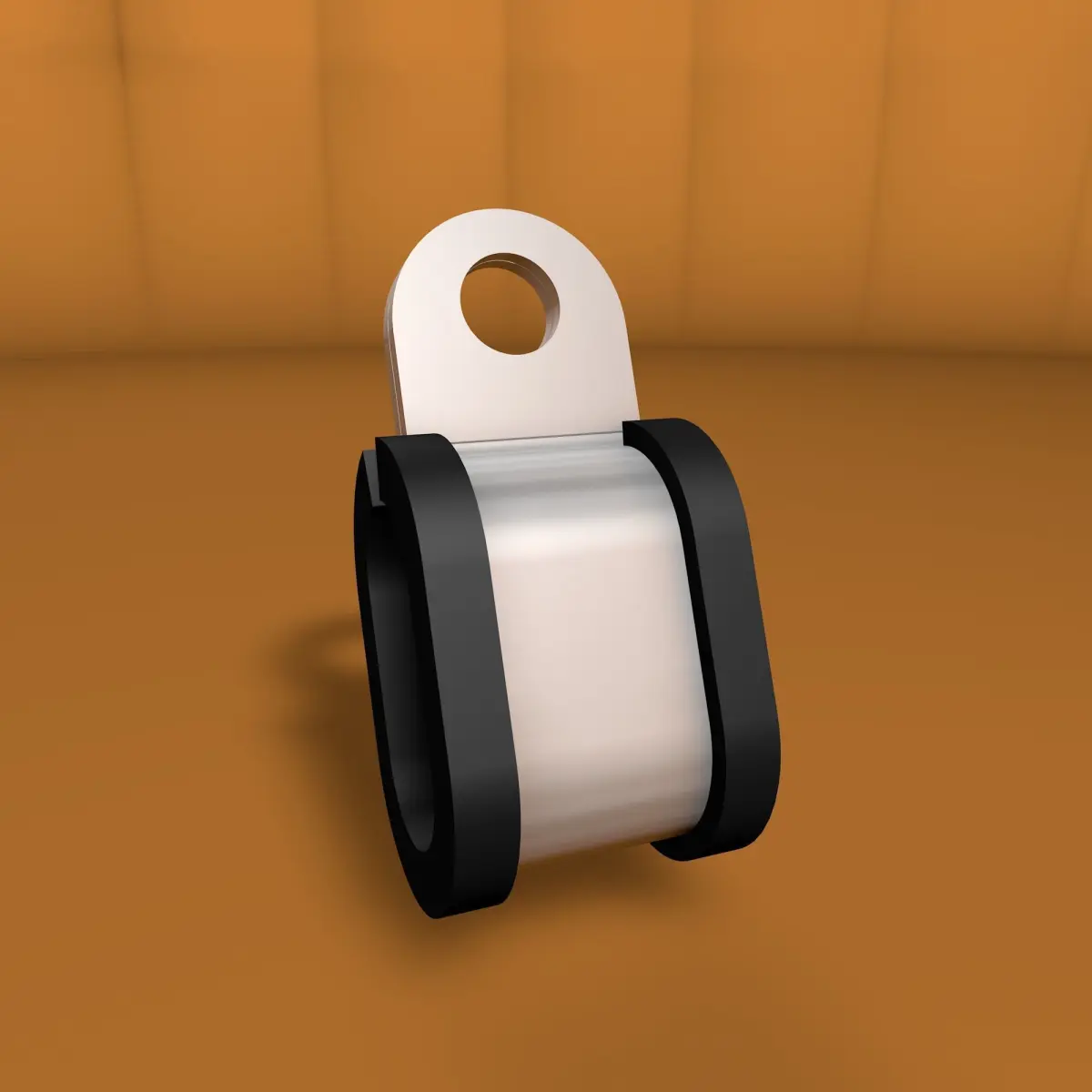 Steel clamp with rubber protection for two cylindrical elements, and to be attached with a hexagonal head bolt. It can be used where exist a lot of relative movement between parts, for example, a hose that comes from an engine and has to be attached to a chassis.Abrazadera de acero con protección de goma para dos elementos cilíndricos, y se fija con un tornillo de cabeza hexagonal. Se puede usar donde exista mucho movimiento relativo entre las piezas, por ejemplo, una manguera que proviene de un motor y debe estar conectada a un chasis.