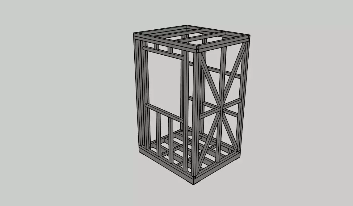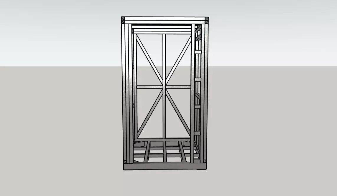 Detailed 3D model of a steel frame structure designed for a modular cabin.Includes metal profiles, base framework, and roof structure.
