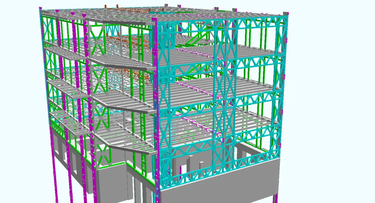 The steel frame, actually built with all the profiles and junctions of the elements that meet the conditions of strength and ultimate deflections according to the building codes. The construction consists of columns, beams, spatial trusses, lift block, is based on pile foundations.Used sections I-beams, channels, angles, welded profiles, square and rectangular pipes.All the nodes of the connection of the structural elements.