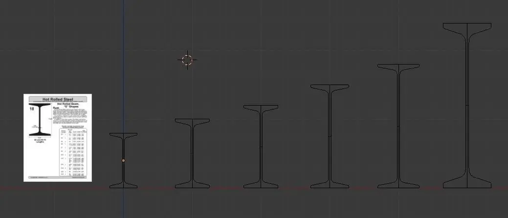 Steel I beam cross sections. 6 sizes: 4x8, 5.5x15, 5x10, 5x12, 6x18 and 7x24. Reference sheet included. Created in Blender. Meshes without materials are available as STL, OBJ and FBX format.