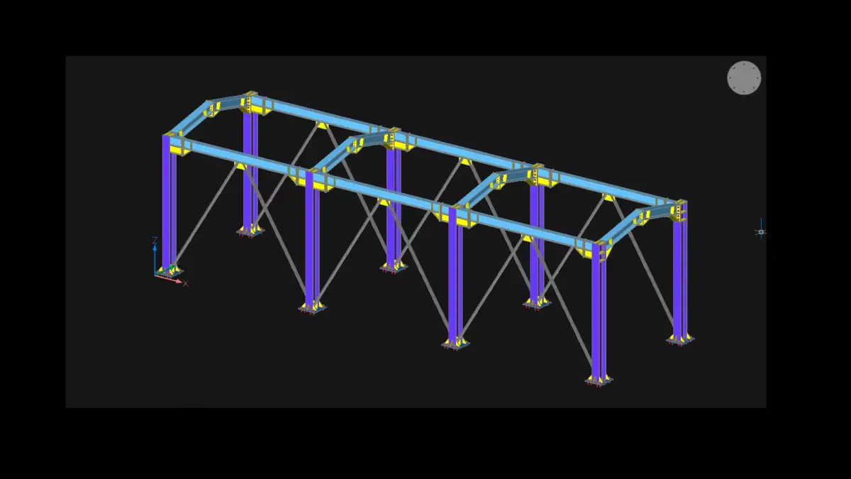 Model features:• Complete structural frame including columns, rafters (inclined beams), and cross bracings• Base plates, stiffeners, and gusset plates modeled with realistic dimensions• Bolt and nut connection details on major joints• Separate layers for columns, rafters, bracings, and connections• Accurate proportions and clean geometry ready for visualization or further detailing