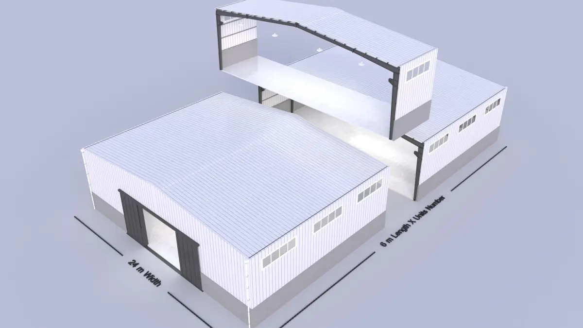 The steel structure warehouse consists of three units (front, middle, and back)Possibility to change the length of the warehouse based on the number of repeating average unitsUnit dimensions 24 meters * 6 meters