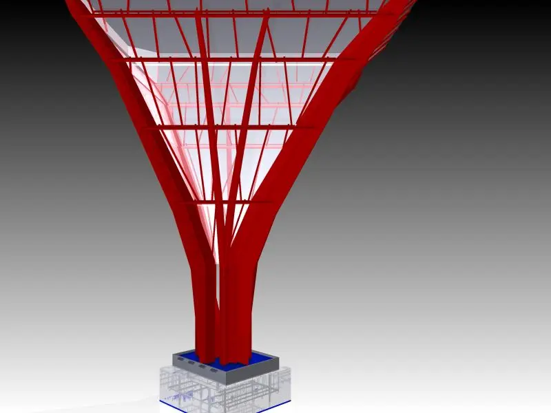 Architectural Design Tree. Steel structure and glass tree, with its trunk and branches, collecting rainwater in the center.