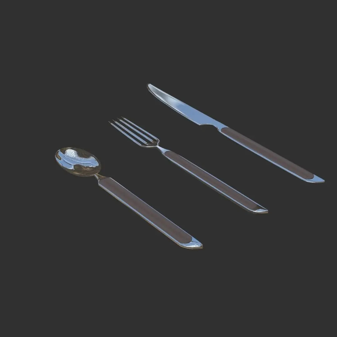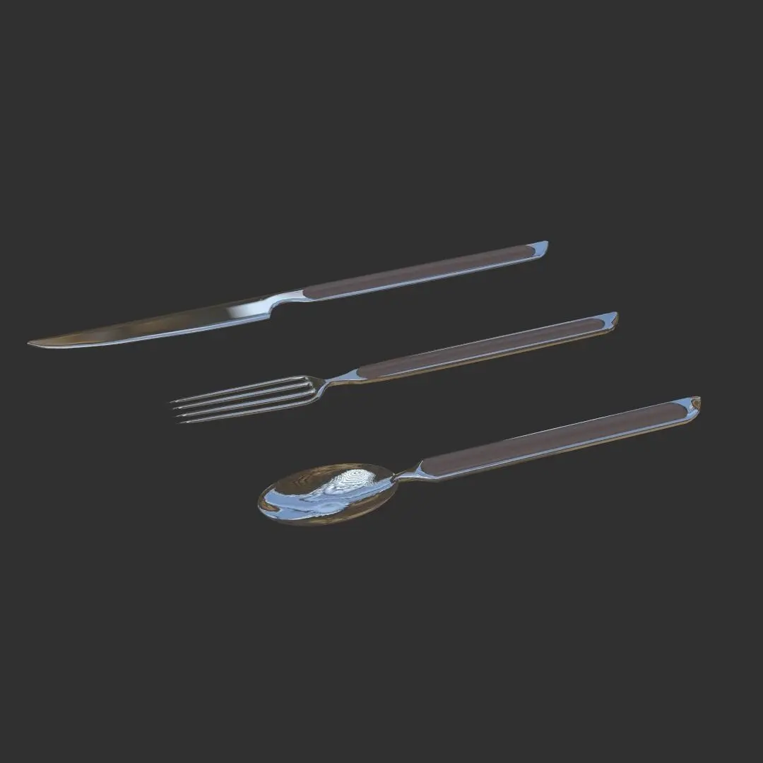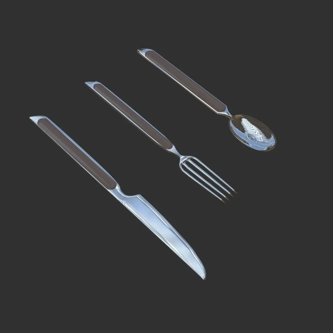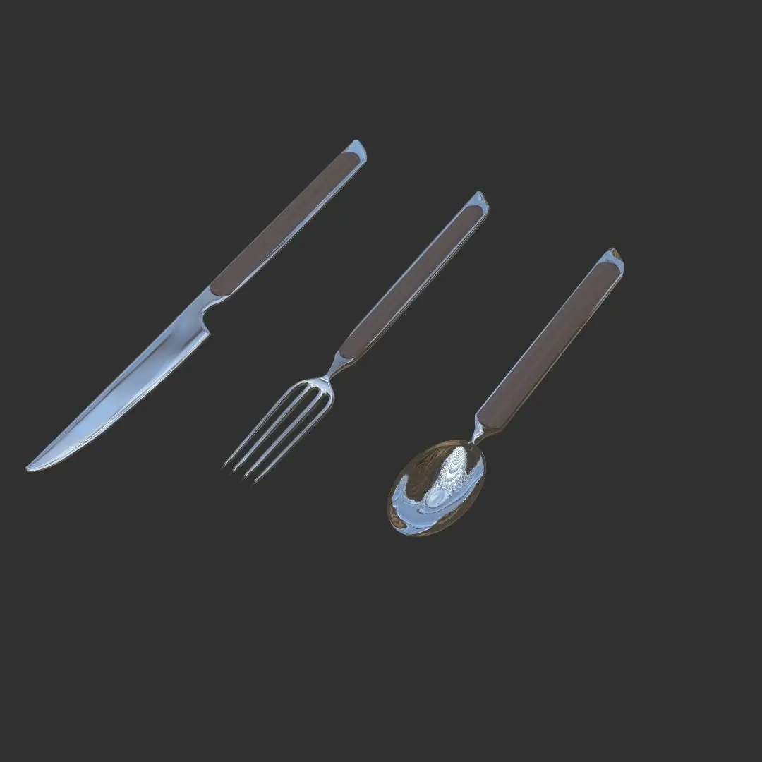 It is a 3D model of steel utensils. It is created in a mobile software prisma 3D and then retextured in Nomad Sculpt. It is a available in gltf format. It consists of a spoon, fork and knife. It is subdivided also. It contains PBR textures.