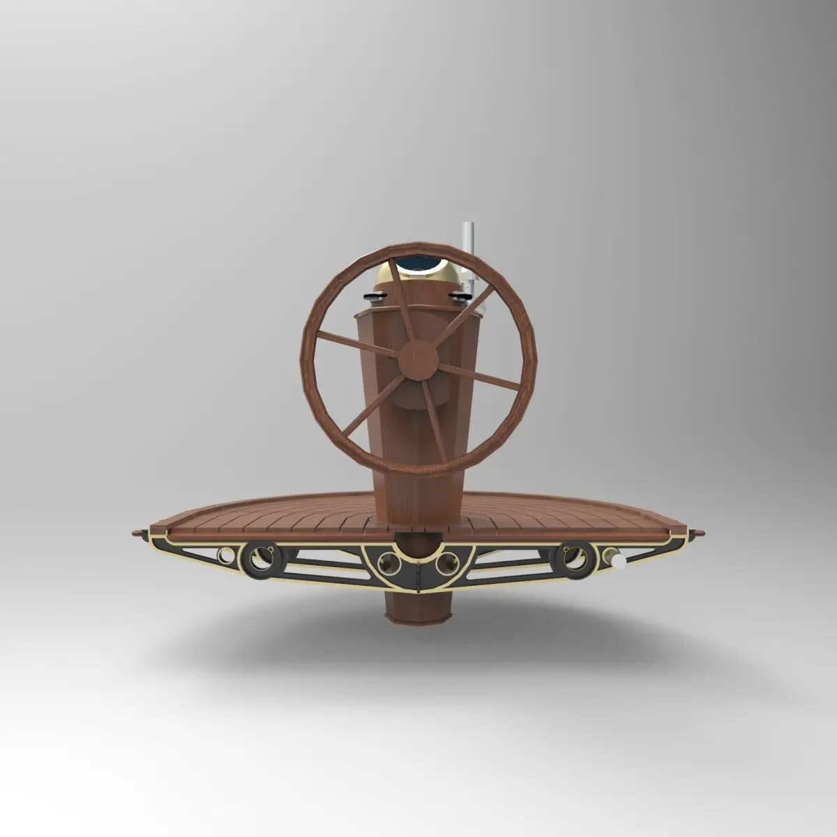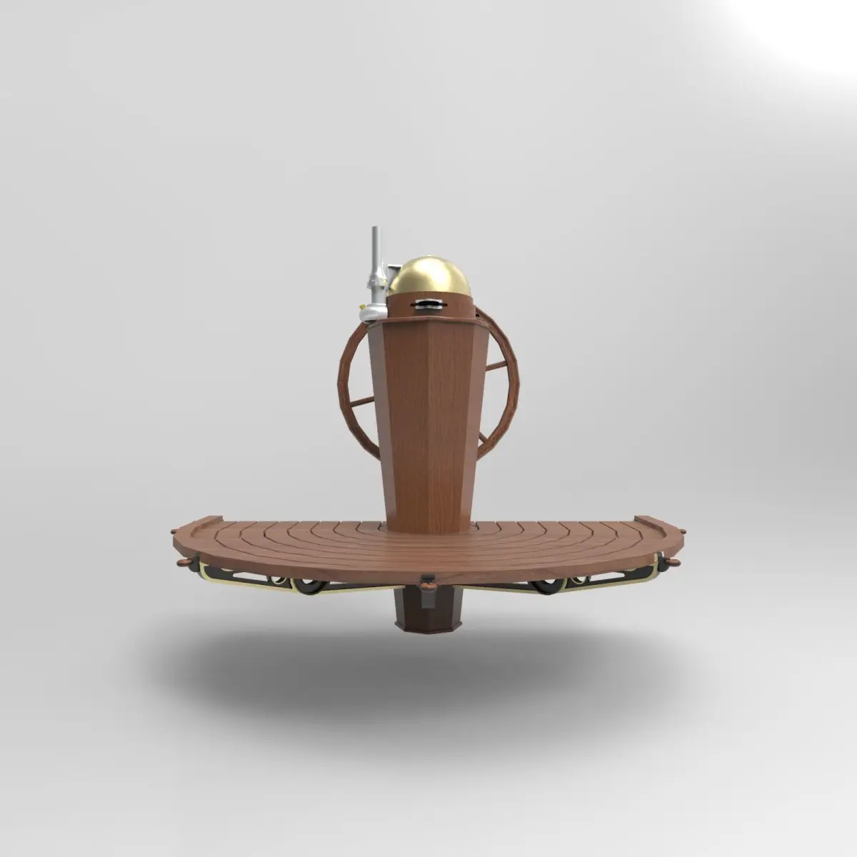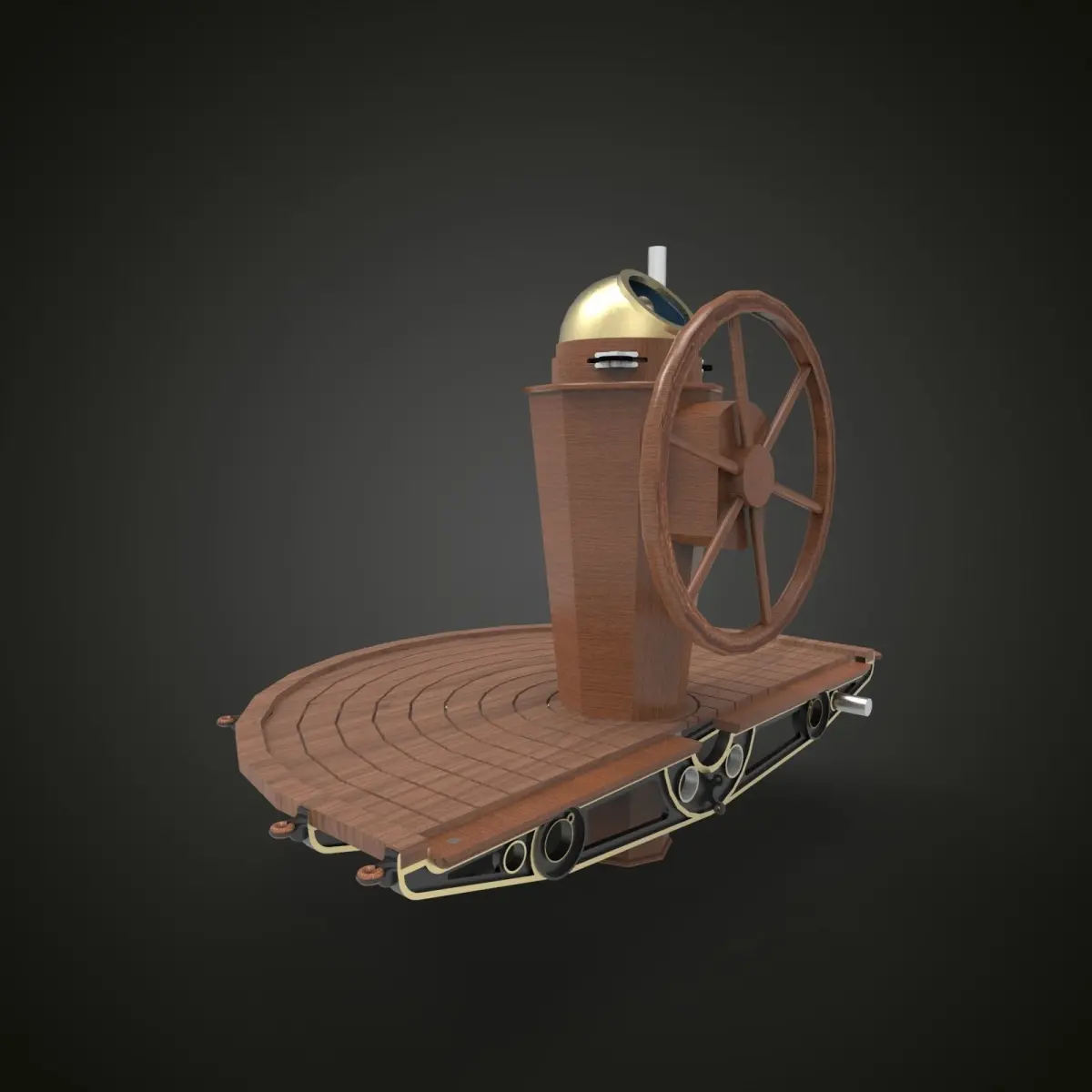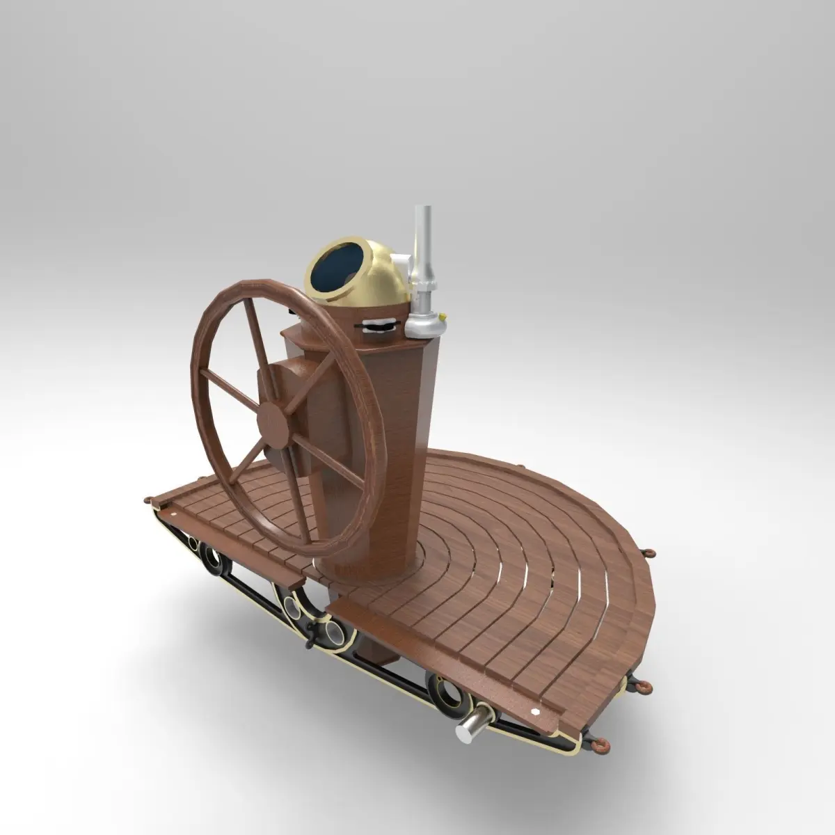 The steering of the boat is performed through the combined action of the positioning of the sail, using the sheet (the rope or ropes that control the sail position), and the rudder, an airfoil shaped board attached by a hinge to the stern (rear) of the boat where it immersed in the water.A binnacle is a waist-high case or stand on the deck of a ship, generally mounted in front of the helmsman, in which navigational instruments are placed for easy and quick reference as well as to protect the delicate instruments. Its traditional purpose was to hold the ship's magnetic compass, mounted in gimbals to keep it level while the ship pitched and rolled. A binnacle may be subdivided into sections and its contents typically include one or more compasses and an oil lamp or other light source. Other devices such as a sand timer for estimating speed may have been stored in the binnacle as well.